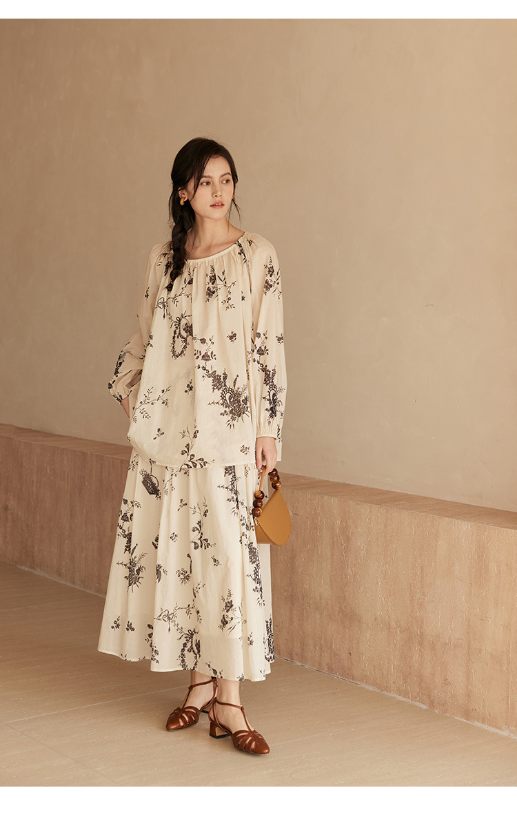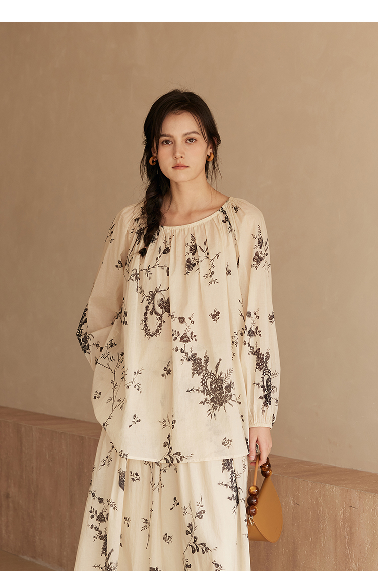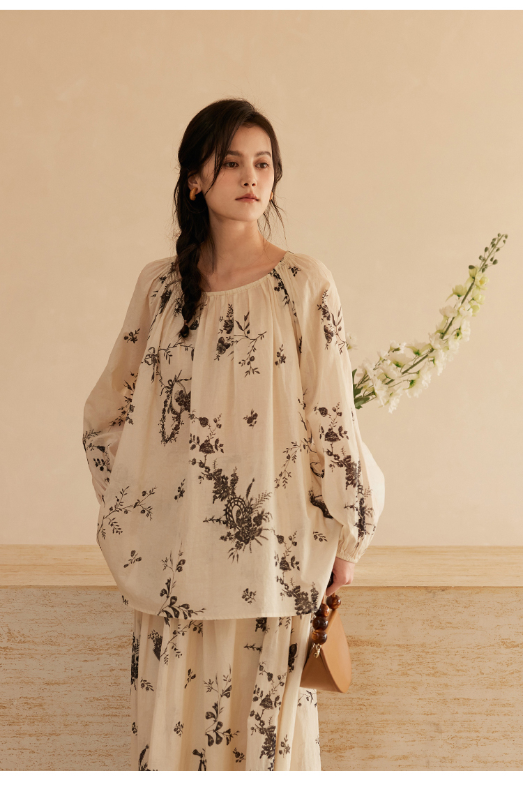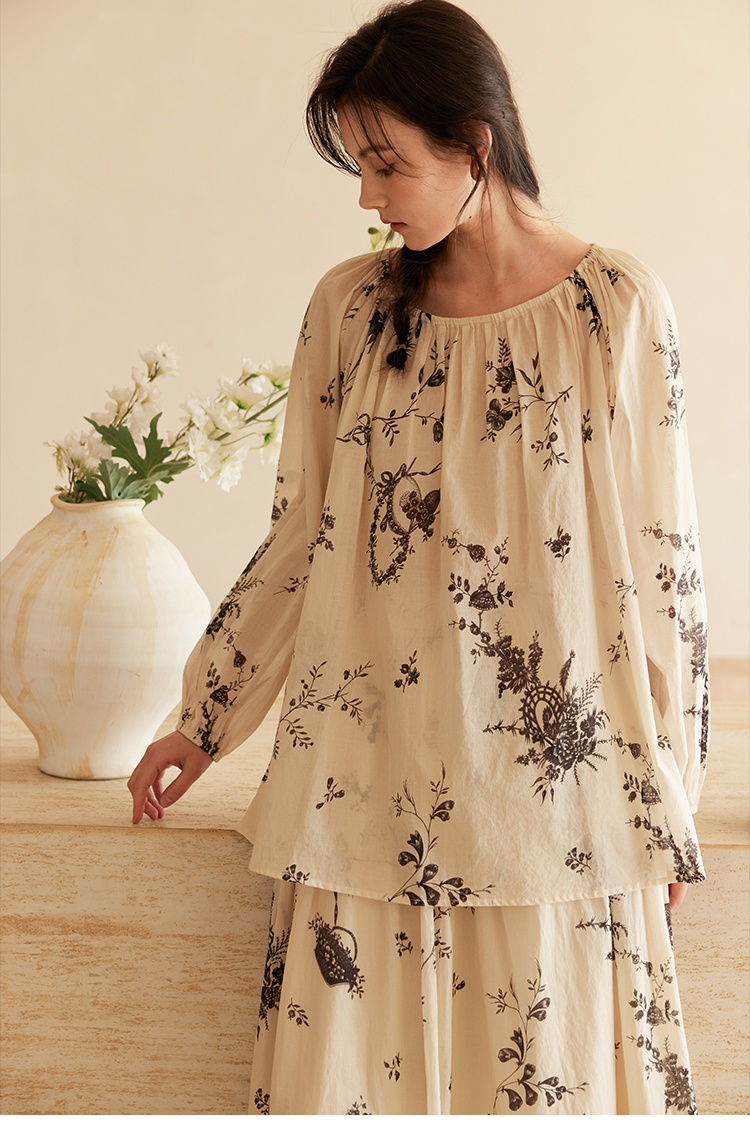HeyDress法式植物印花衬衫女春季复古宽松纯棉衬衣慵懒气质上衣