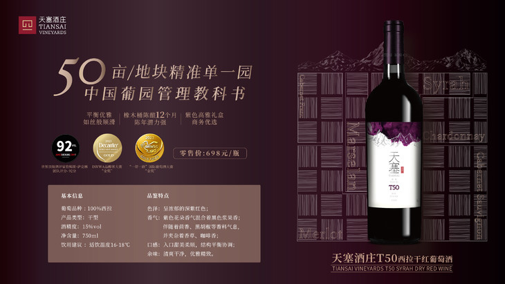 【中国酒】天塞酒庄T20霞多丽干白 和 天塞酒庄T50西拉干红