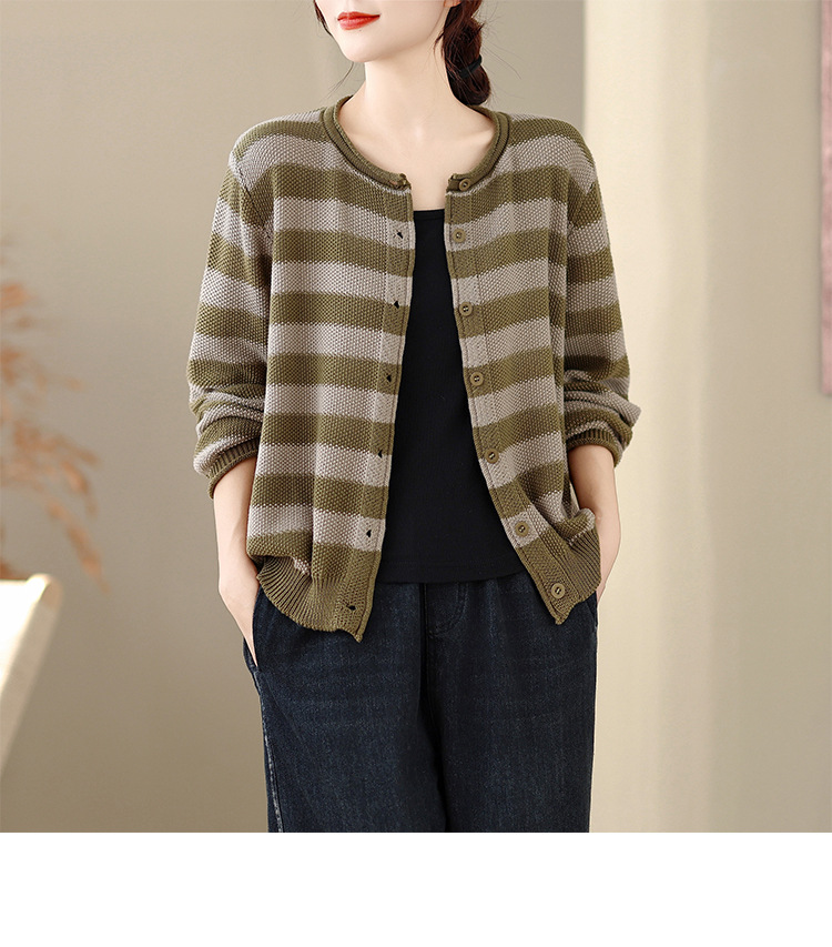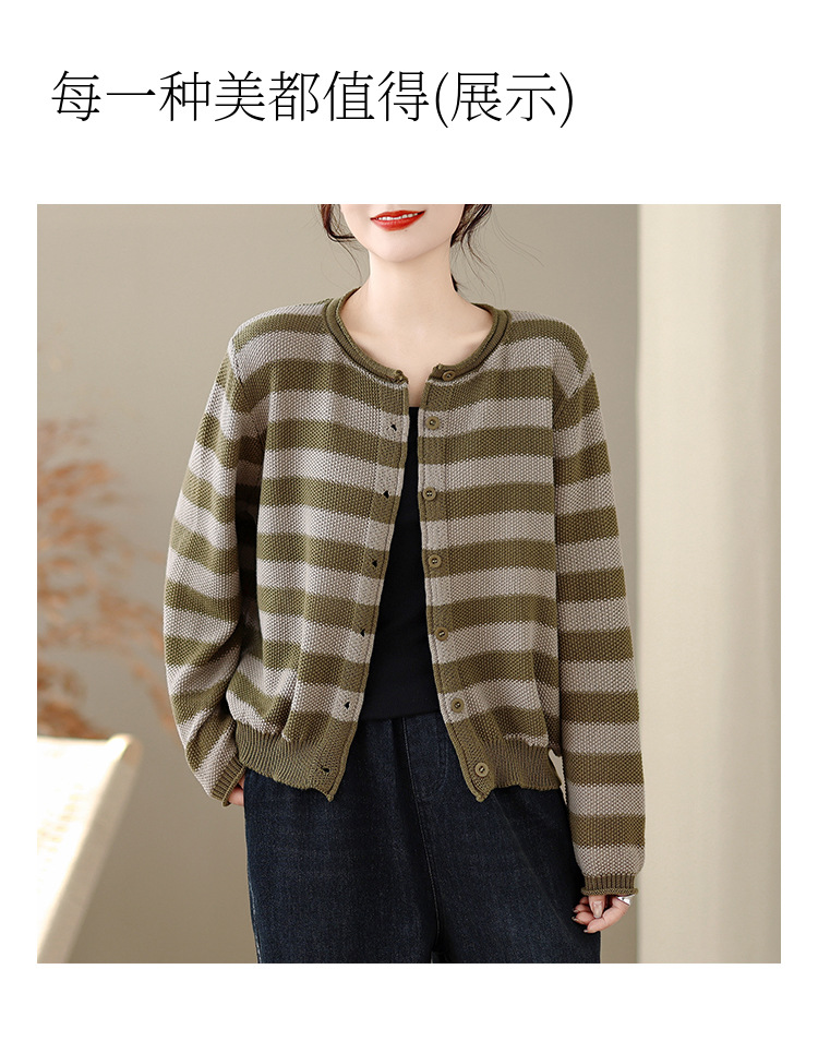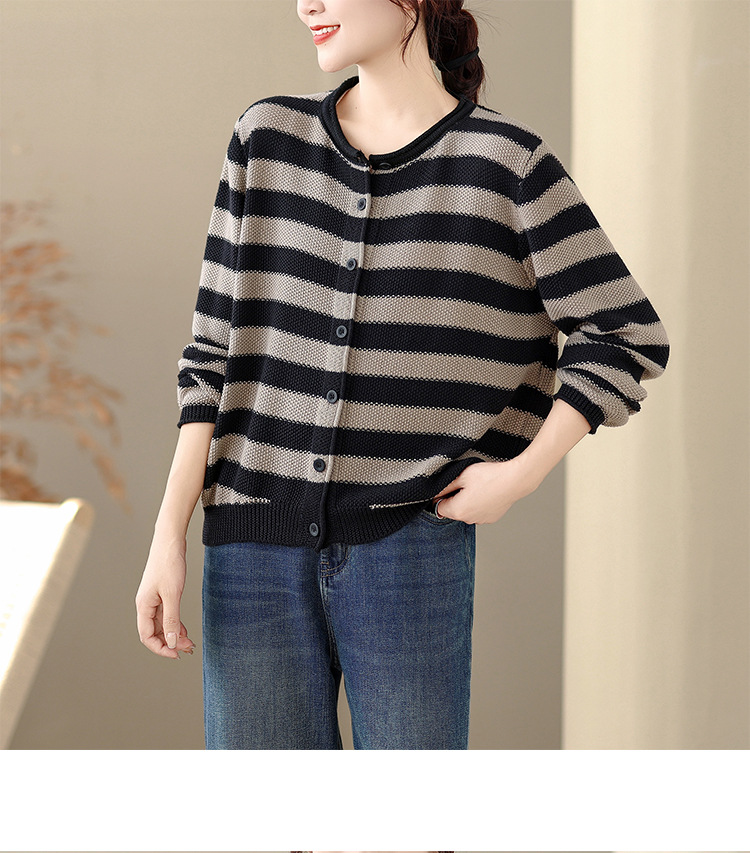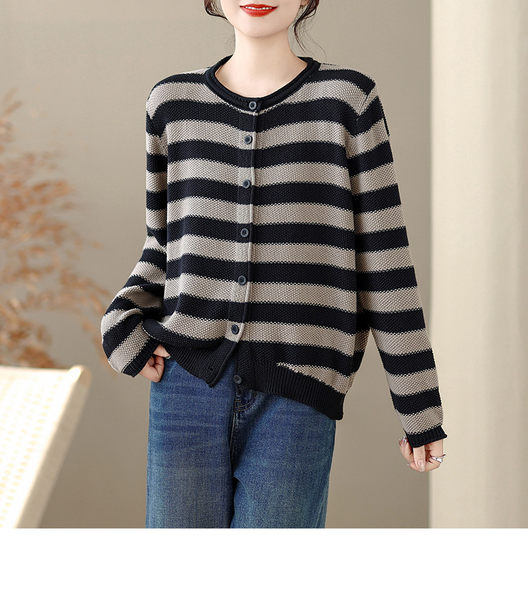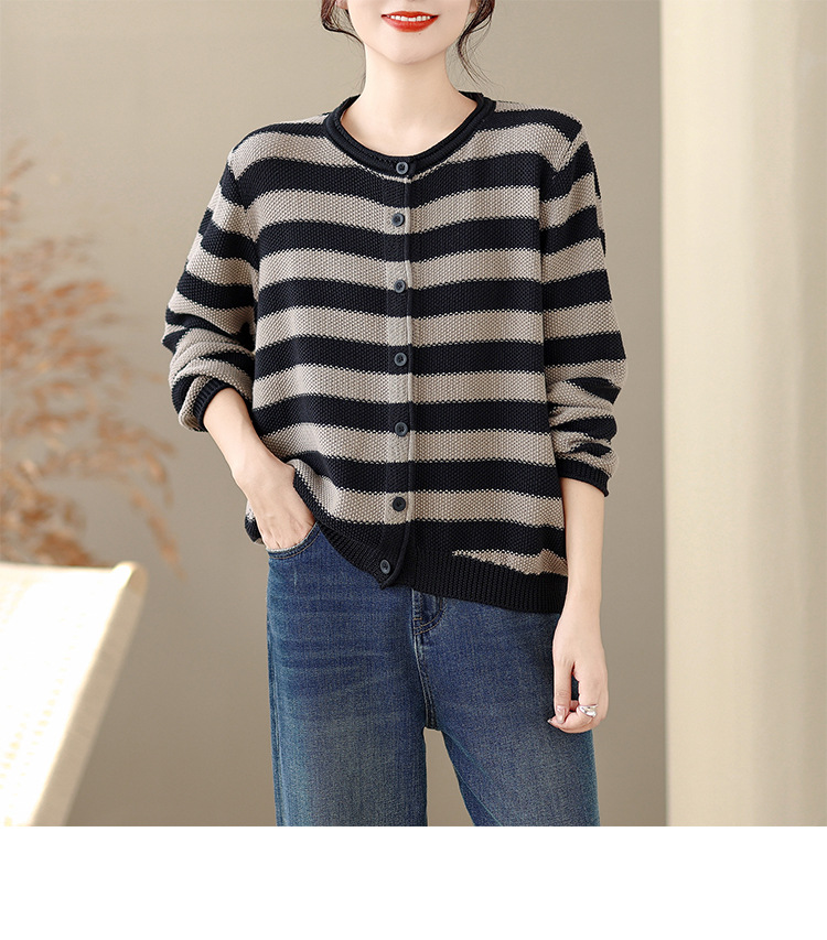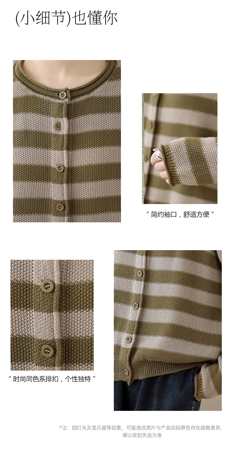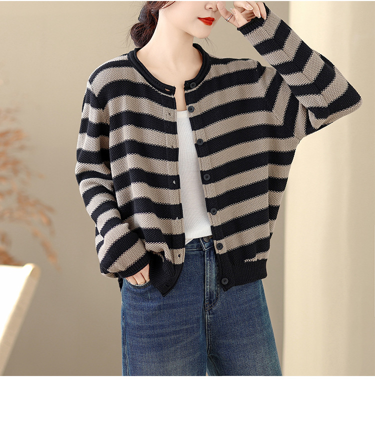 C025-818925新款秋冬复古慵懒风撞色条纹长袖针织开衫宽松显瘦毛衣外套