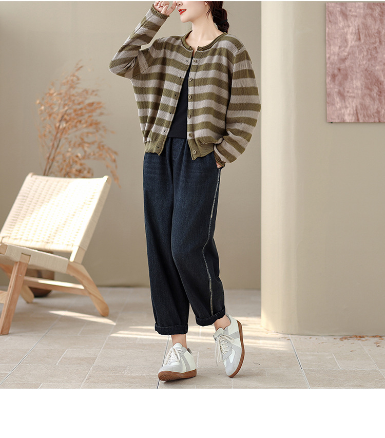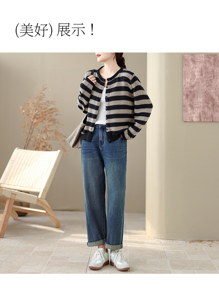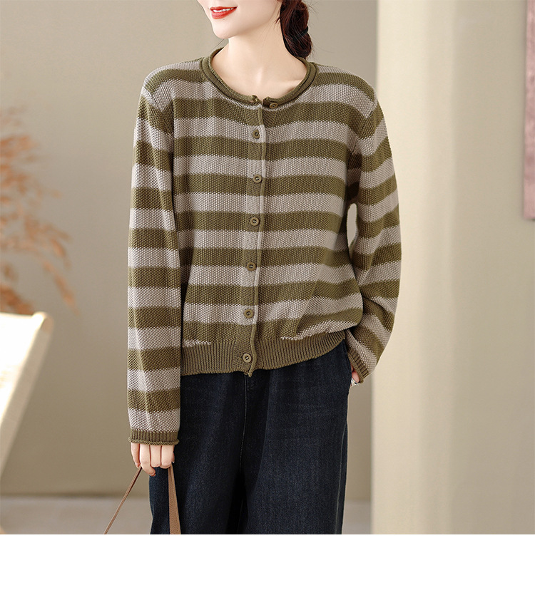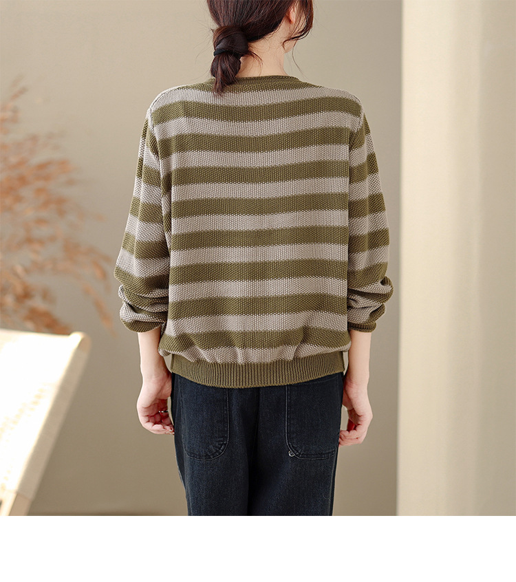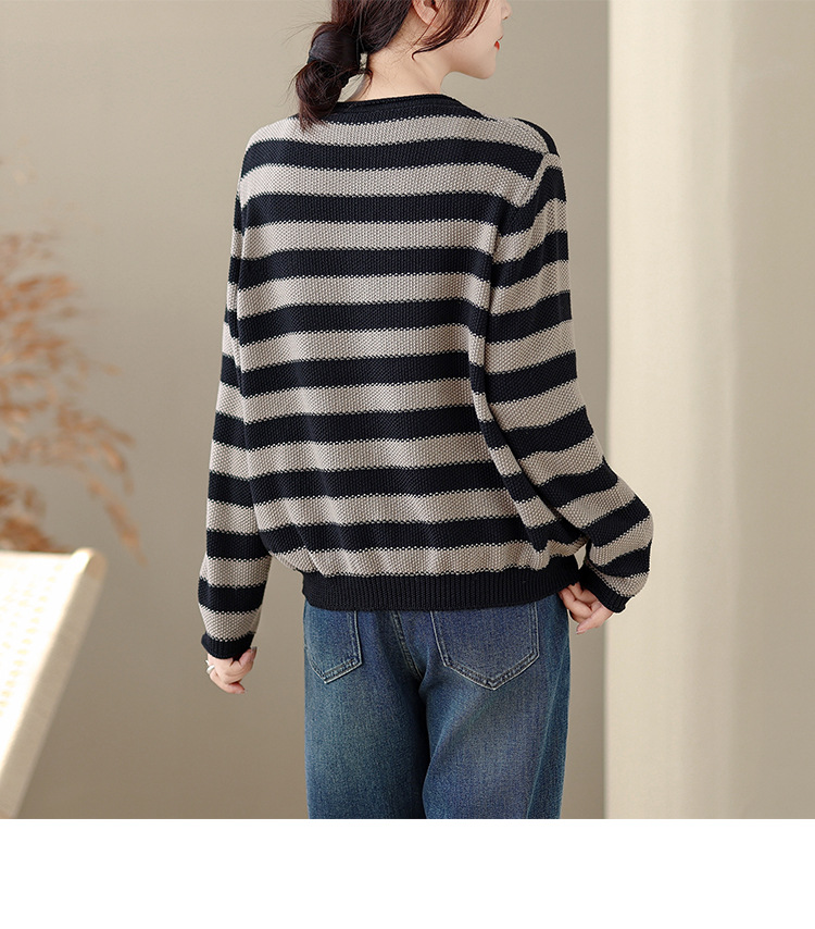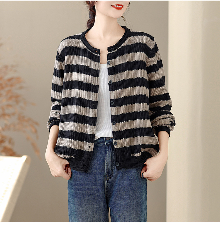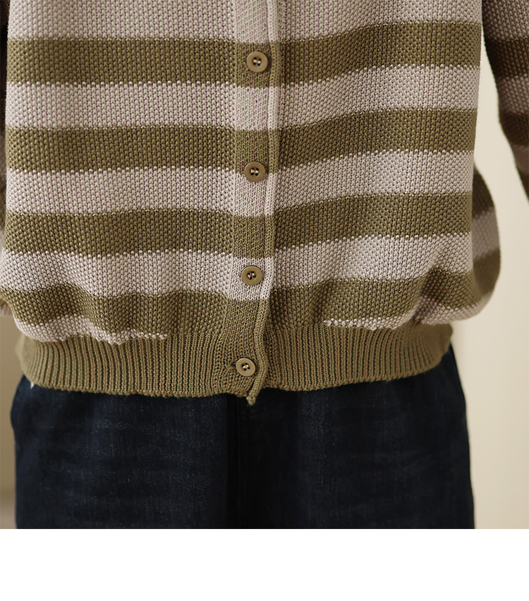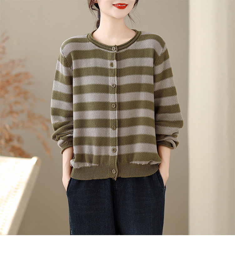 C025-818925新款秋冬复古慵懒风撞色条纹长袖针织开衫宽松显瘦毛衣外套