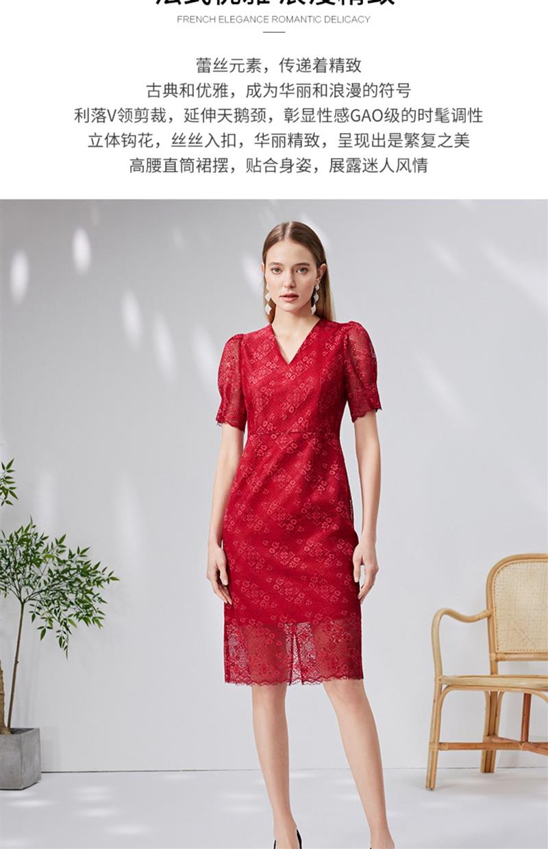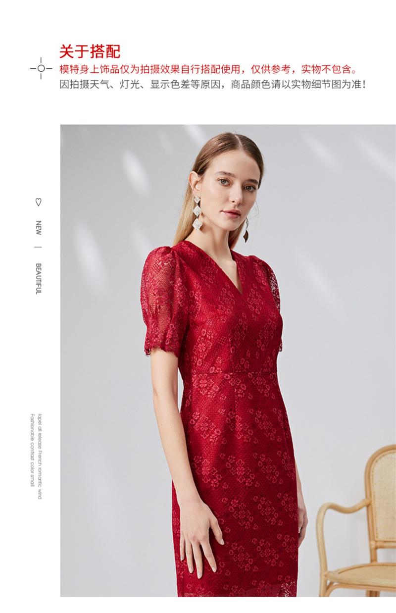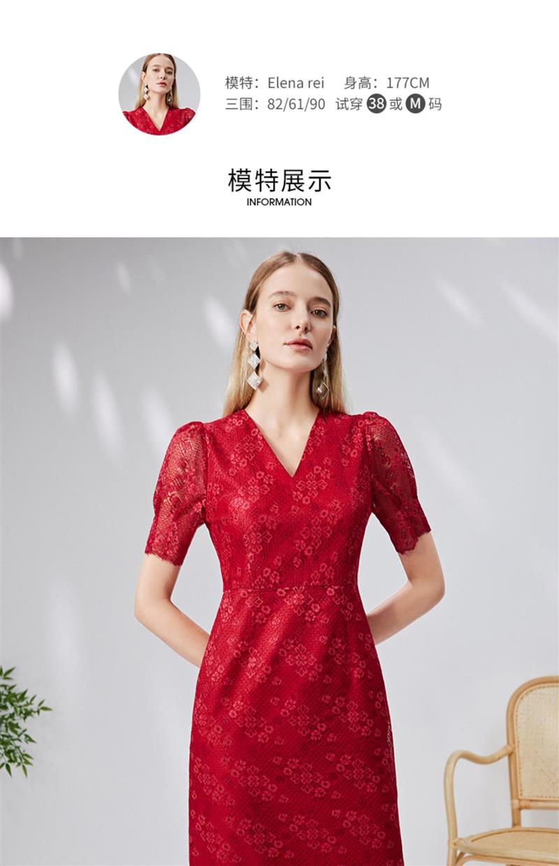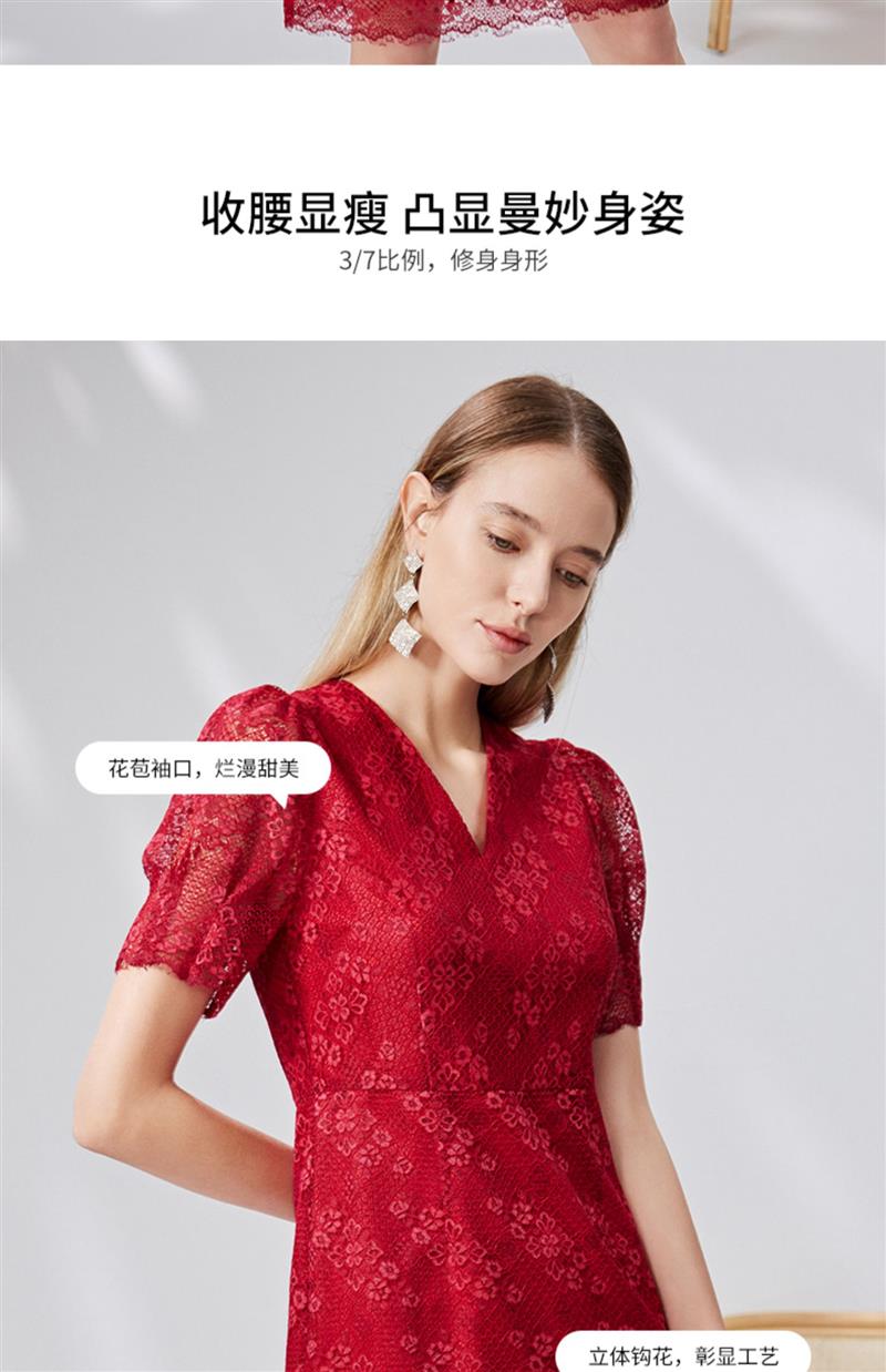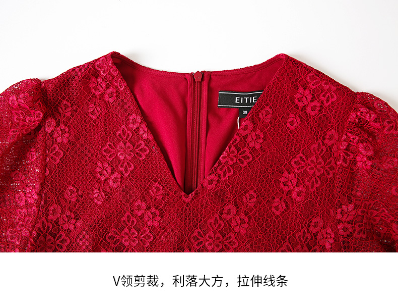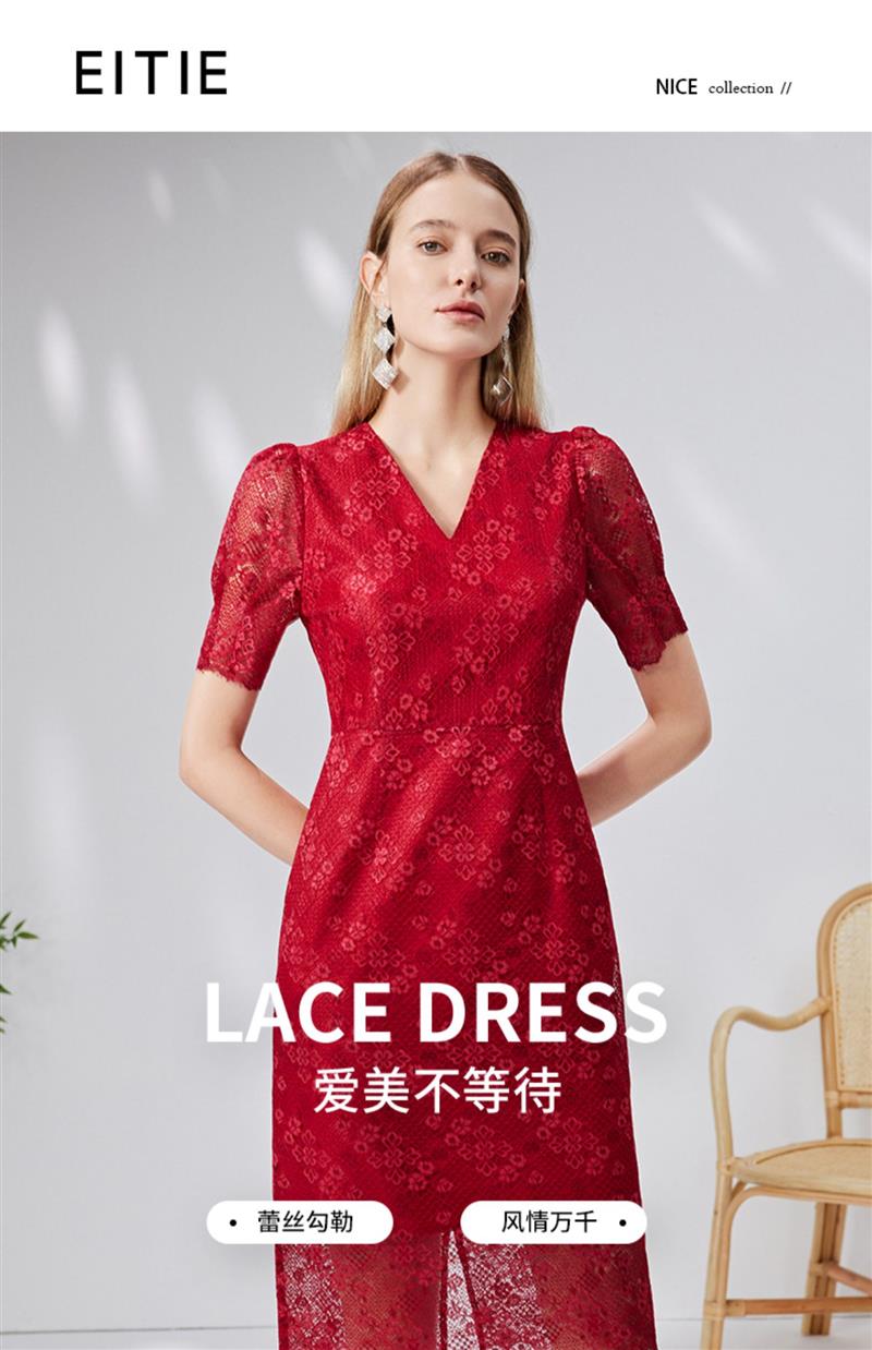 EITIE爱特爱气质V领红色蕾丝连衣裙法式优雅大方时尚显瘦夏新款B2307146