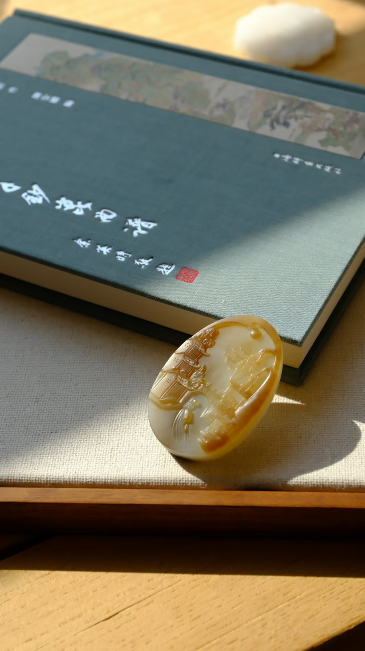 用和田糖玉雕云中江树,月下归舟,