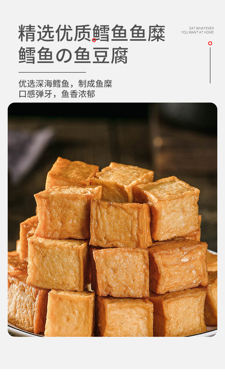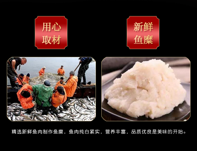2.原材料采用金线鱼、鳕鱼新鲜鱼肉制作鱼糜,将新鲜的原材料剁至胶状,严格按照出口标准生产,品质优良的食材是美味的开始。