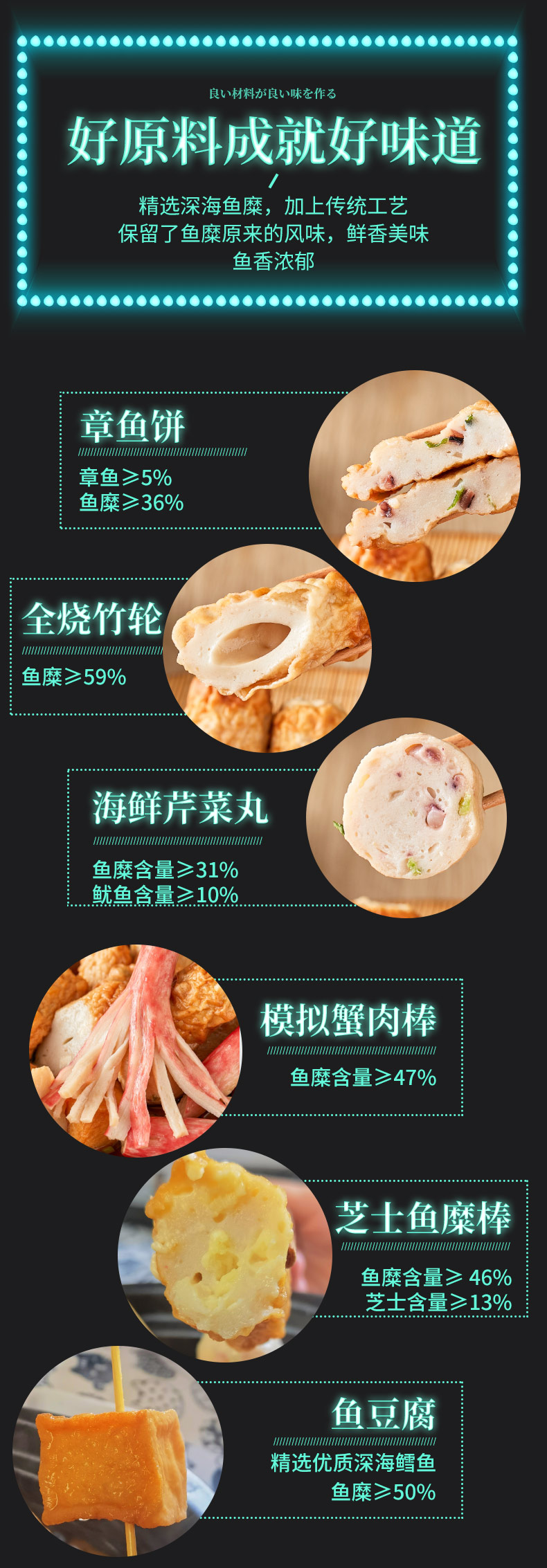 1.精选日式关东煮中超高人气王炸组合,获中国火锅食材节金奖的鱼饼、中国冷冻冷藏食品创新奖的竹轮,低卡低脂高蛋白,6种鱼饼鱼糕,满足你的胃,更满足你减肥的心!