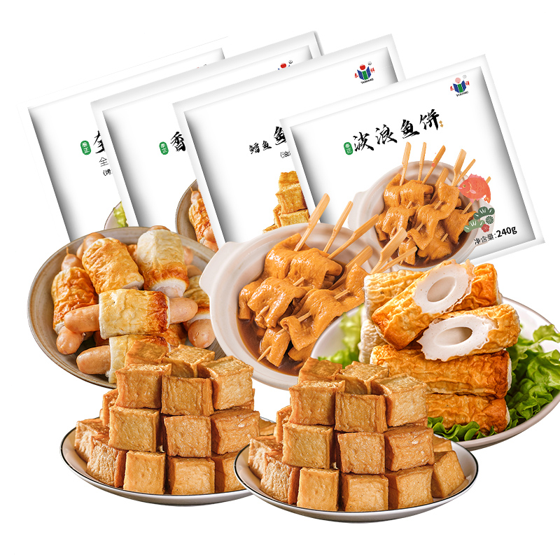 4种组合,大袋装:750g/袋(鱼豆腐150g/袋*2+全烧竹轮150g/袋+香肠竹轮150g/袋+波浪卷鱼饼150g/袋)