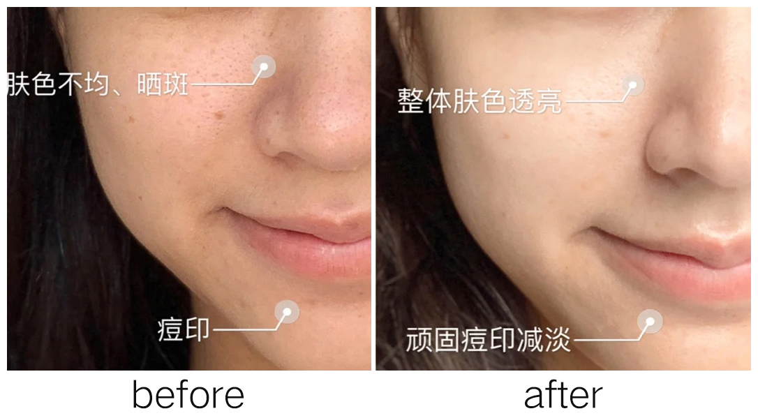 一直用,不仅色斑进一步变淡,连痘印、黯沉和肤色不均也慢慢改善了,整个脸都白白净净。