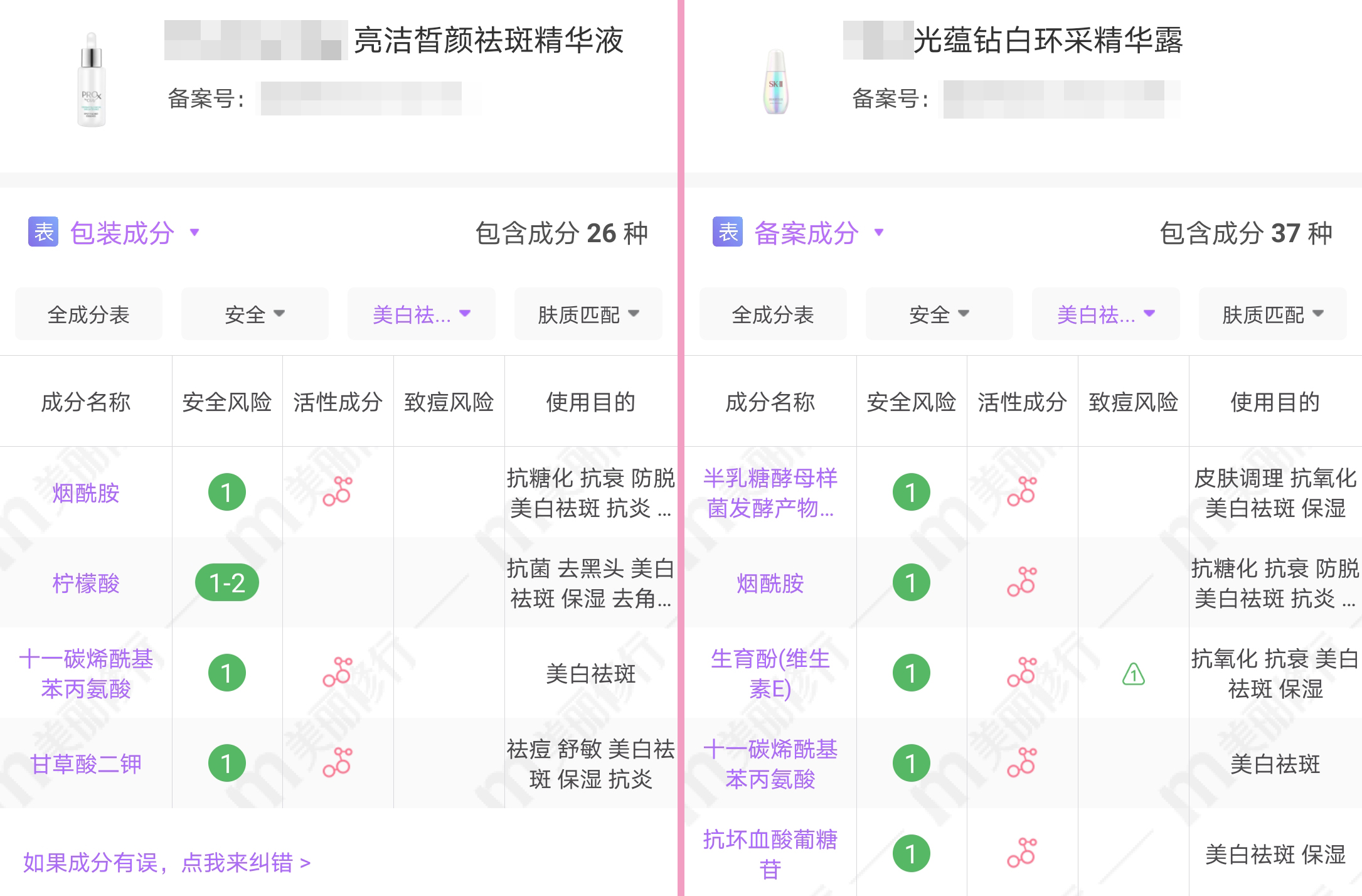 其实大家有所不知,市面上的淡斑成分普遍贵如金,只有大牌精华才舍得添加。大部分产品只复配了1、2种,所以仅限于浅层淡斑、短暂美白。