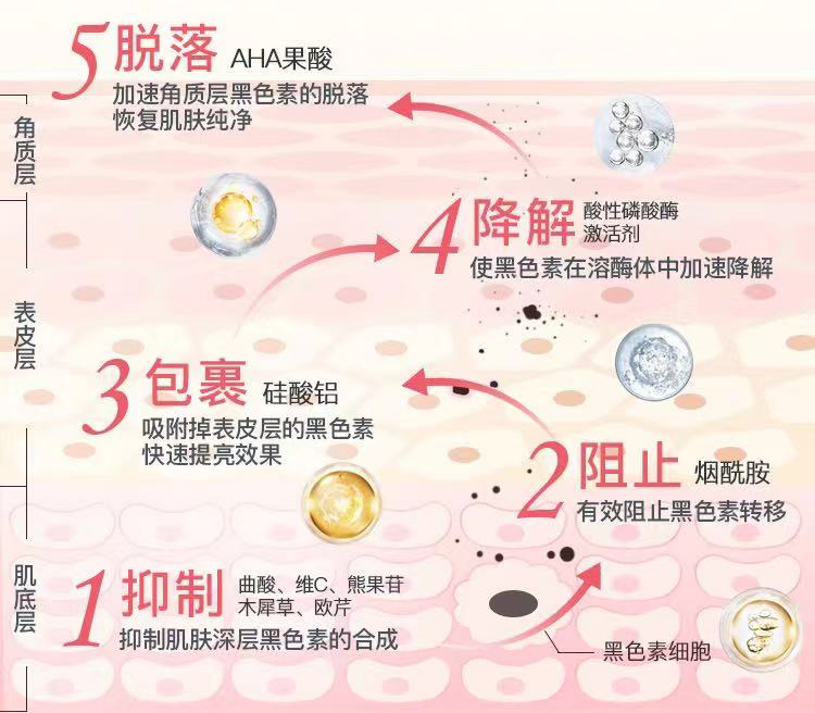 抑制色素—阻止转移—包裹降解——脱落斑点