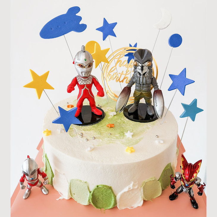 师傅用抹茶粉装饰,0色素 法国淡奶油+新鲜芒果夹心,更照顾孩子们的健康。奥特曼精美手办搭配造型