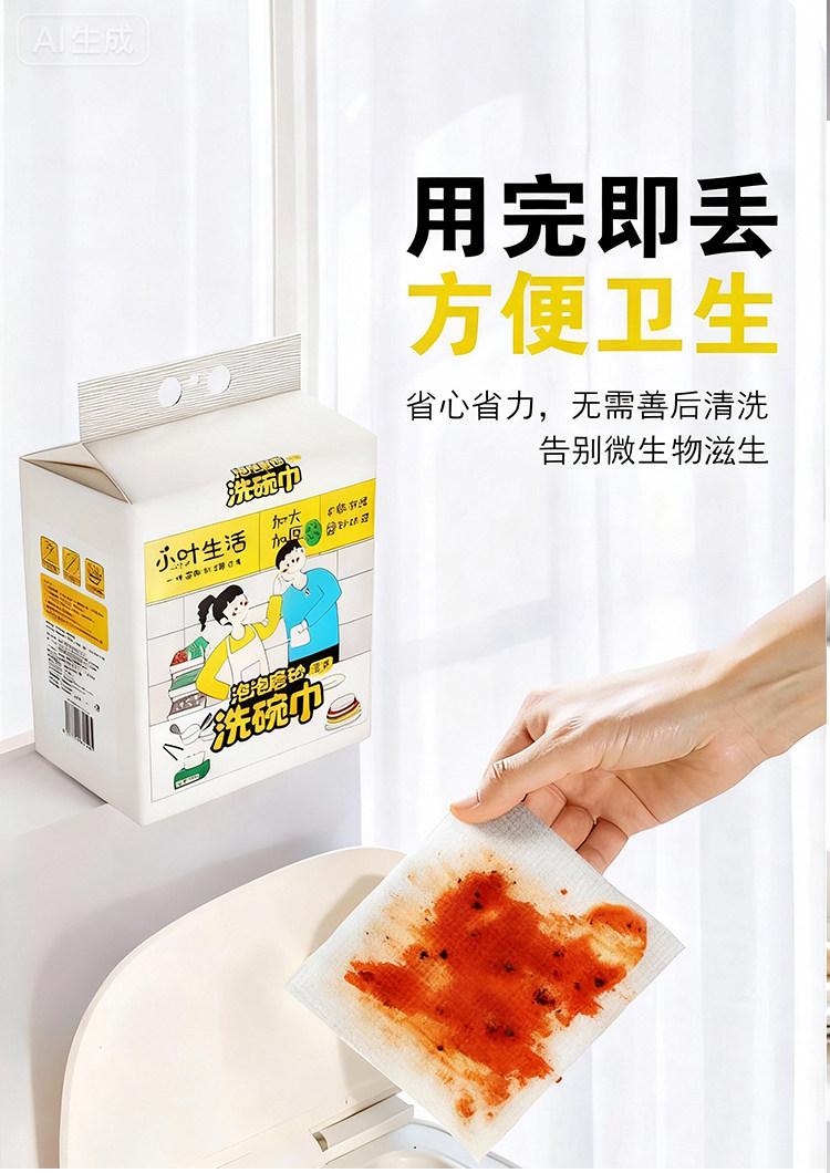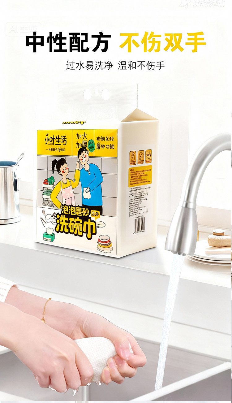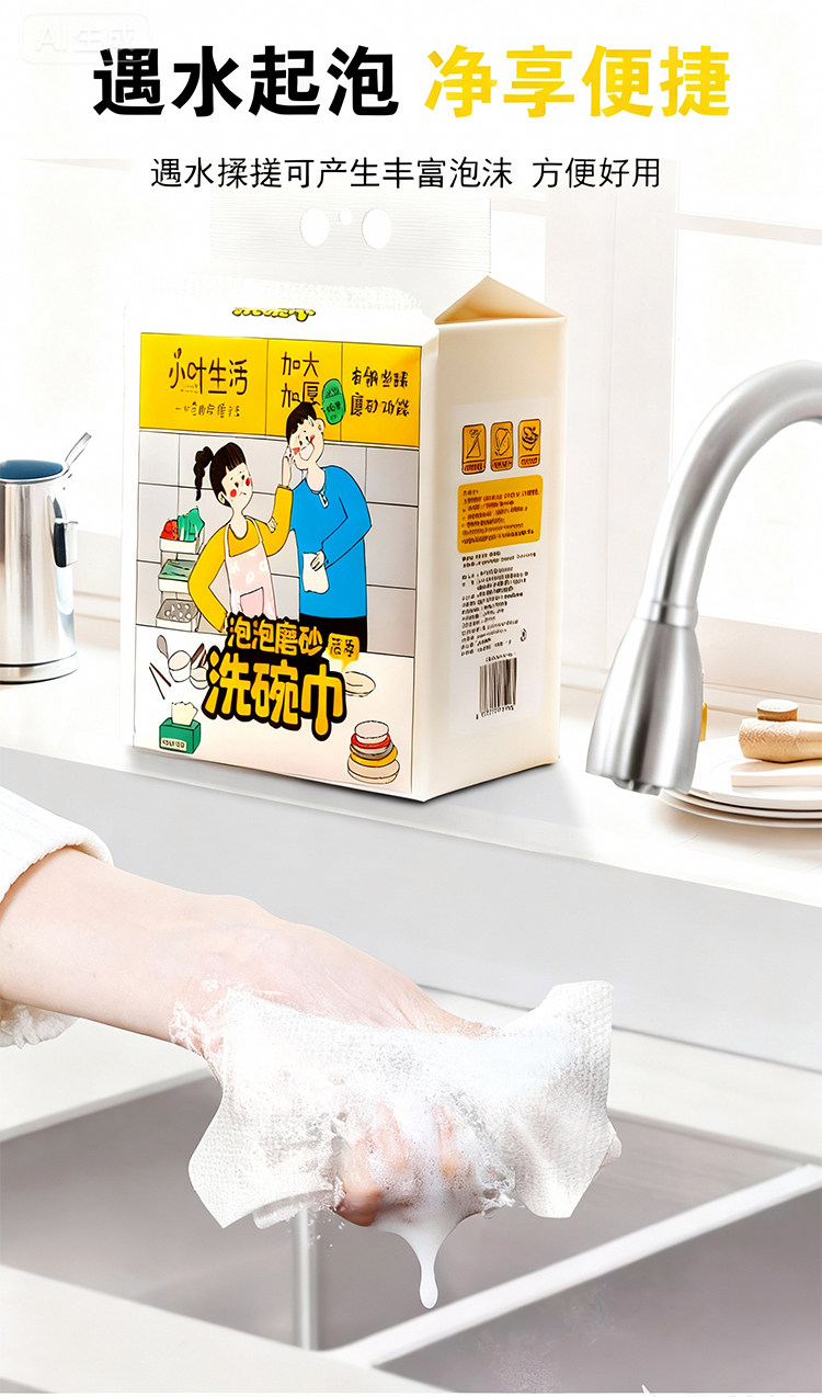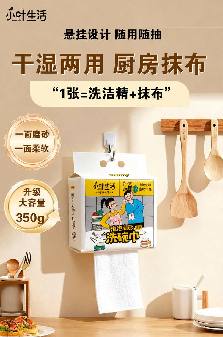磨砂洗碗巾【品质之选!49块9到手4包!加赠4个挂钩!】小叶生活泡泡磨砂洗碗巾|1张=洗洁精+抹布!一抽即用,擦拭碗碟不留痕~基地直邮
