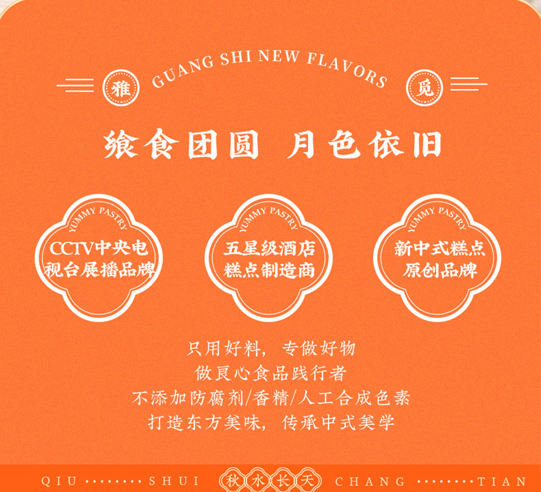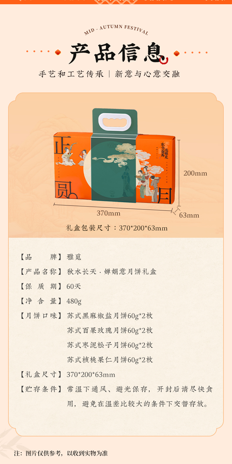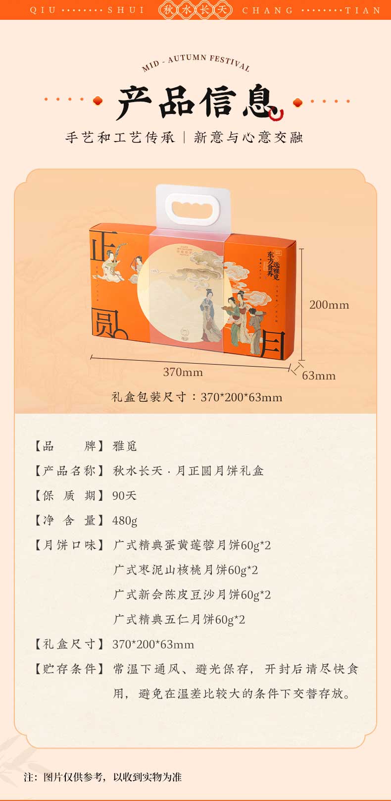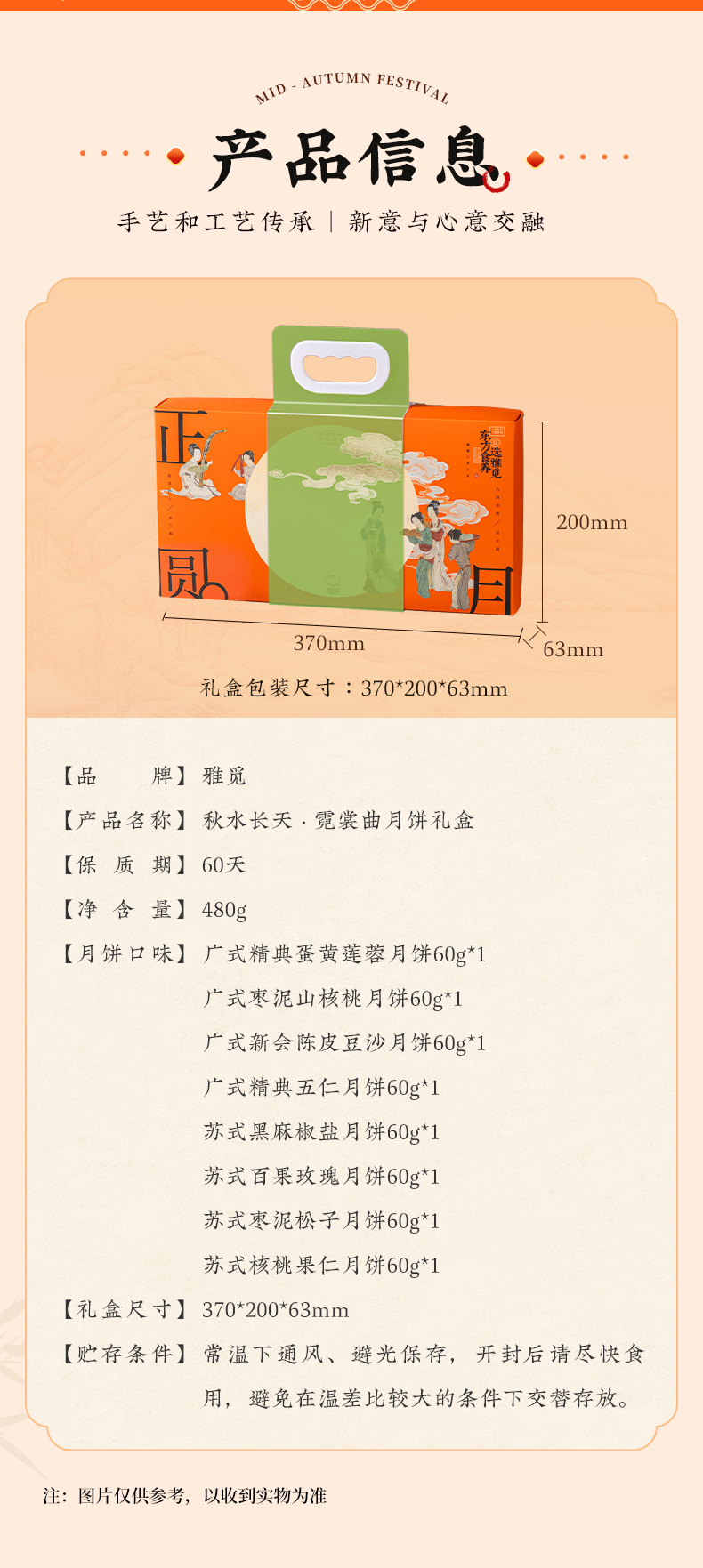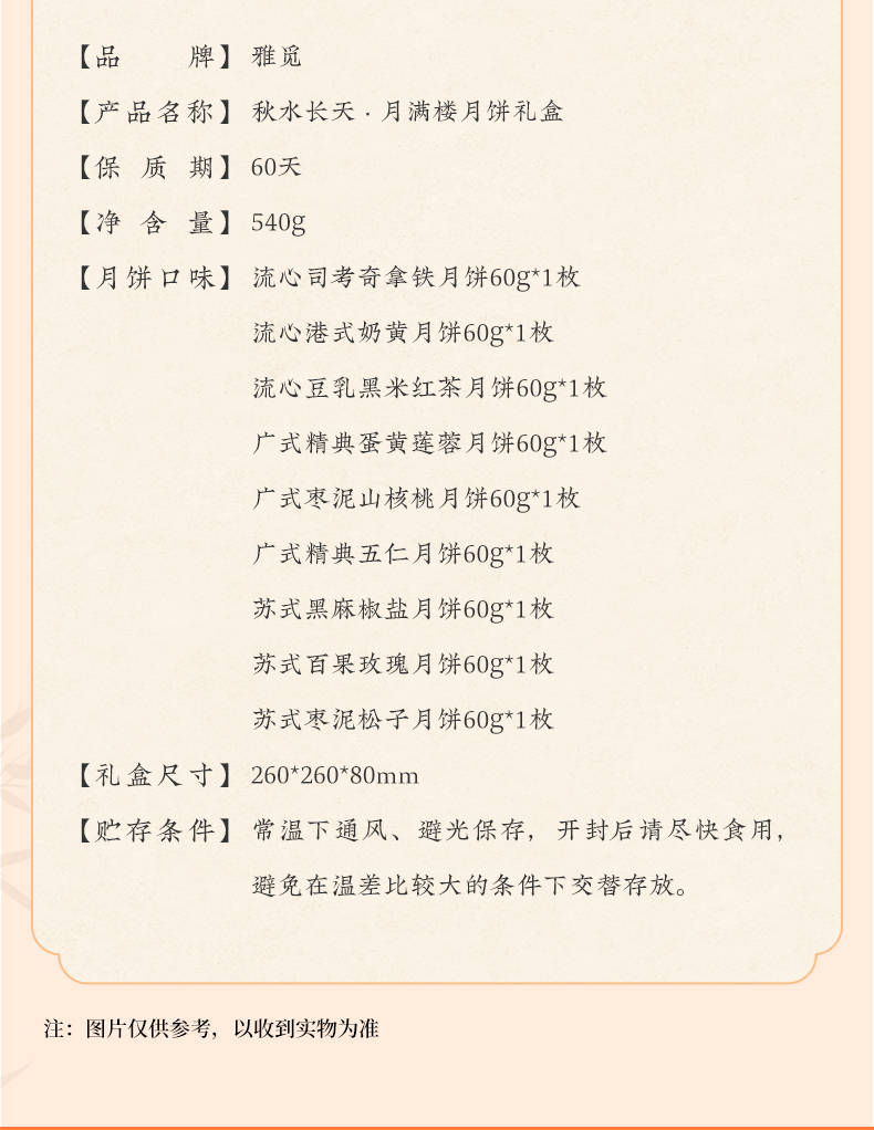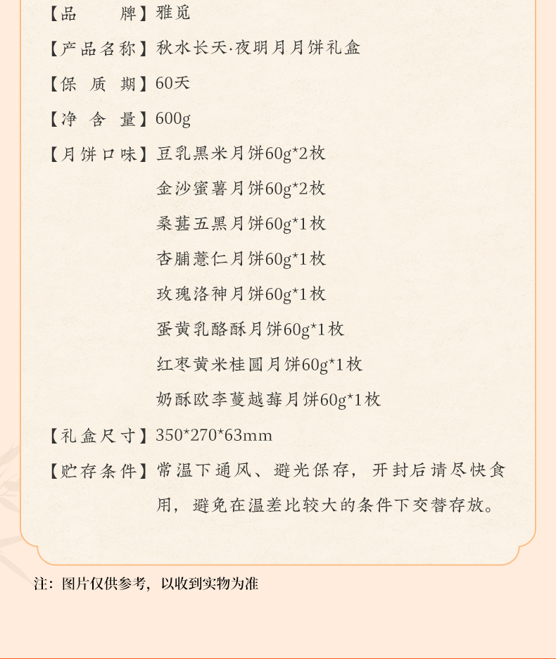 | 【品名】雅觅秋水长天系列月饼礼盒 【规格】 广式精典蛋黄莲蓉月饼 广式枣泥山核桃月饼 广式精典五仁月饼 广式新会陈皮豆沙月饼 规格2:秋水长天·霓裳曲月饼礼盒480g(8粒8味) 广式精典蛋黄莲蓉月饼 式枣泥山核桃月饼 广式精典五仁月饼 广式新会陈皮豆沙月饼 苏式黑麻擂沙月饼 苏式百果玫瑰月饼 苏式枣泥松子月饼 苏式核桃果仁月饼 规格3:秋水长天·婵娟意月饼礼盒480g(8粒4味) 苏式黑麻擂沙月饼 苏式百果玫瑰月饼 苏式枣泥松子月饼 苏式核桃果仁月饼 规格4:秋水长天·夜明月月饼礼盒600g(10粒8味) 豆乳黑米月饼 金沙蜜薯月饼 红枣黄米桂圆月饼 桑葚五黑月饼 杏脯薏仁月饼 玫瑰洛神月饼 奶酥欧李蔓越莓月饼 蛋黄乳酪酥月饼 规格5:秋水长天·月满楼月饼礼盒540g(9粒9味) 流心司考奇拿铁月饼 流心港式奶黄月饼 流心豆乳黑米红茶月饼 广式精典蛋黄莲蓉月饼 式枣泥山核桃月饼 广式精典五仁月饼 苏式黑麻擂沙月饼 苏式百果玫瑰月饼 苏式枣泥松子月饼 【保质期】60天 【贮存条件】请置于阴凉、干燥、通风处常温储存 【产地】河北邯郸 【发货地】河北邯郸 【发货快递】顺丰、中通、京东、邮政 【不发货区域】新疆、西藏、青海、云南、港澳台地区不发 【发货时效】48小时,周末节假日顺延 【售后情况】节日类产品不支持无理由退换货,赠品不售后。 |