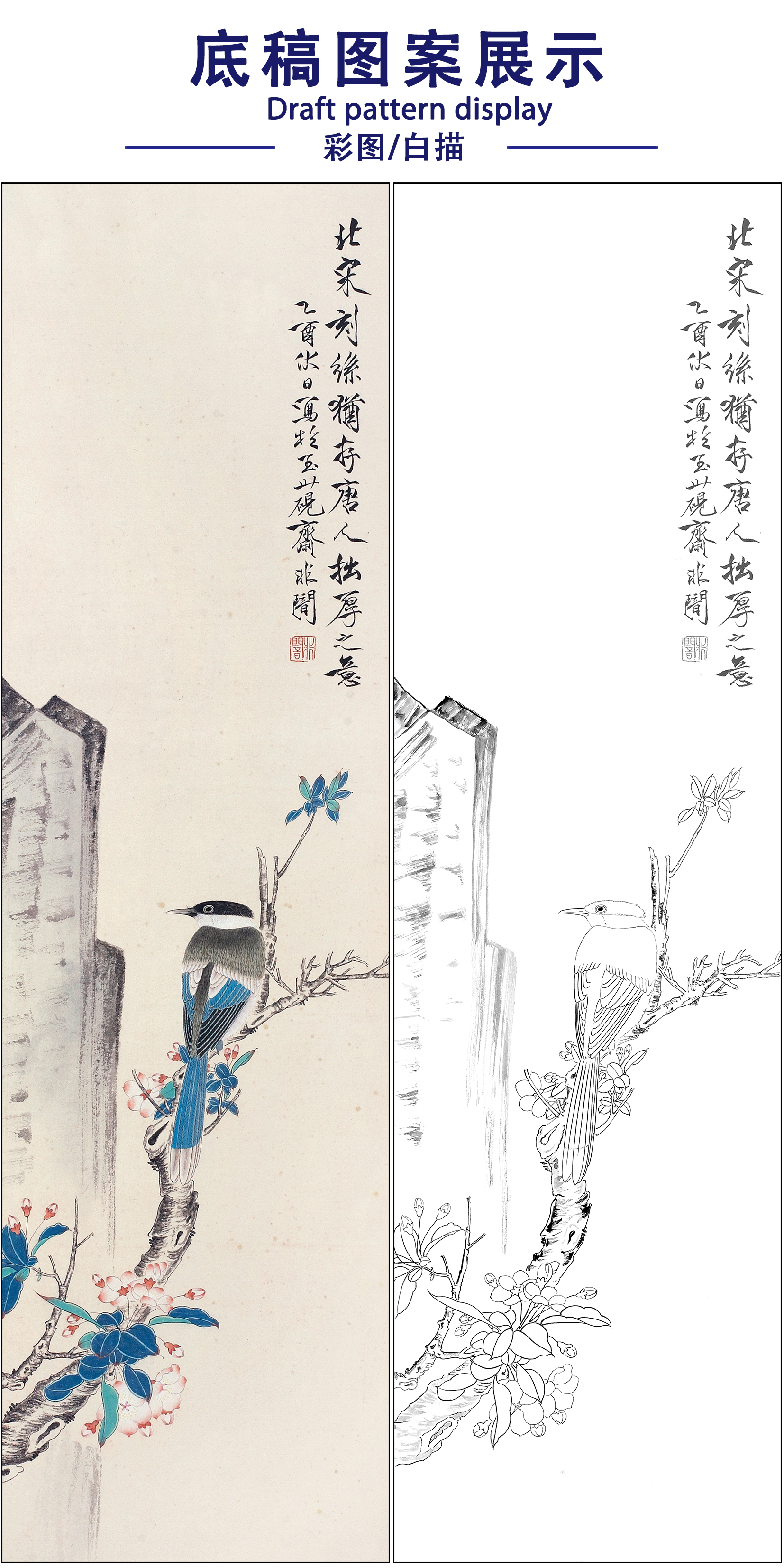 工笔画白描底稿于非闇花鸟《花鸟》临摹勾线高清打印稿FA46