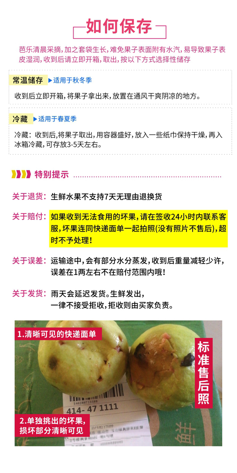 ①芭乐属于自然生长,受环境影响,部分果子表面带有斑点、果疤,个头大小现象属于正常现象,不在售后范围内。