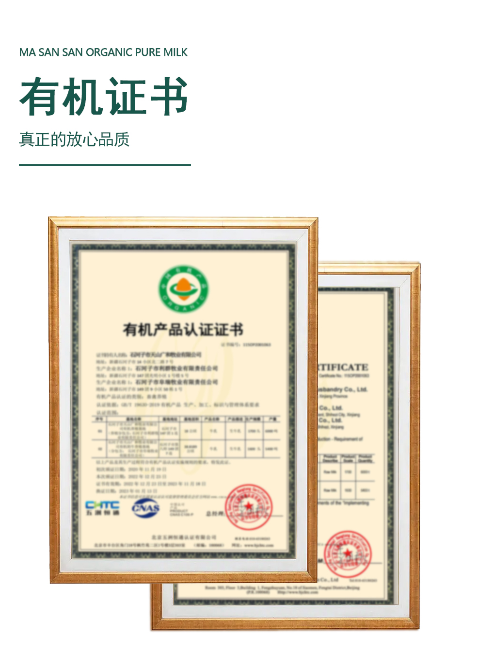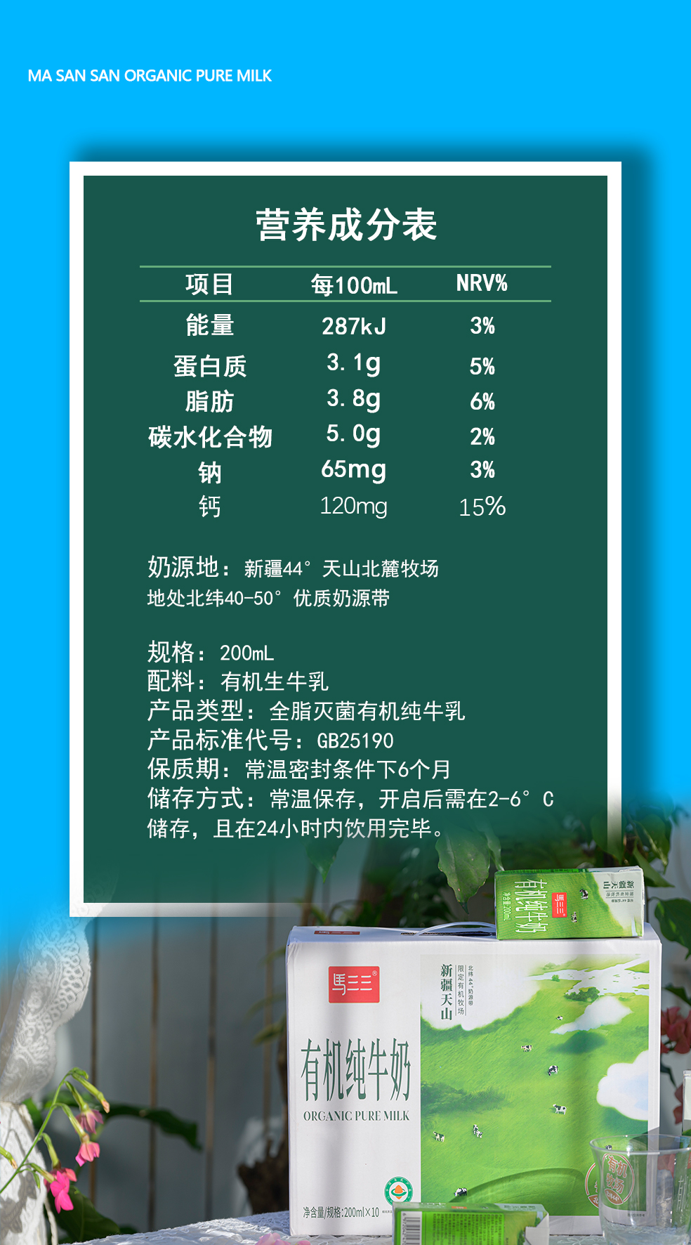 马三三有机纯牛奶200ml*12盒 有机牧草 0污染0农残