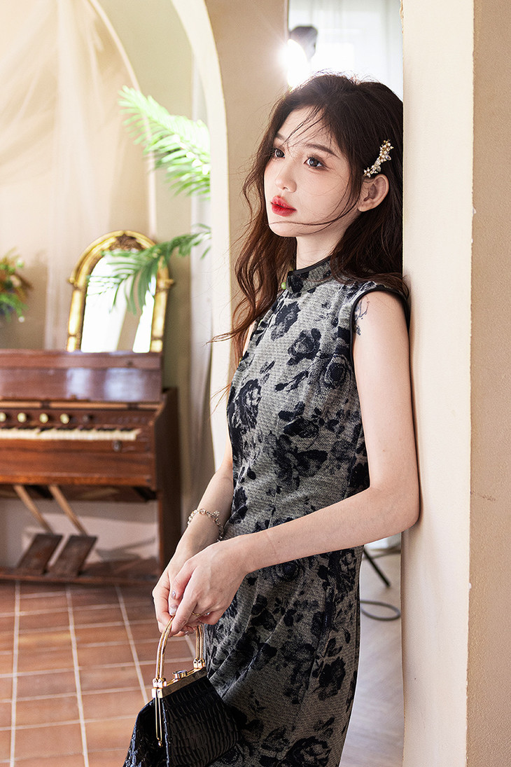 2024秋冬新款无袖双层扎染弹力中长水墨画中国风修身旗袍YT2860 商品图1