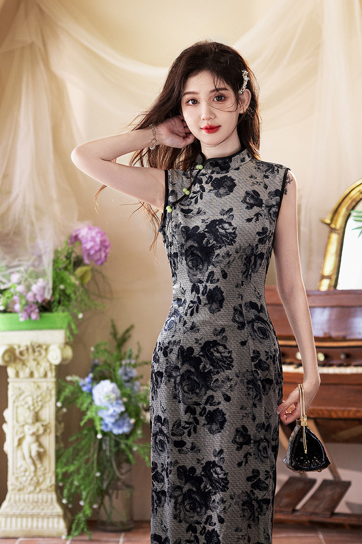 2024秋冬新款无袖双层扎染弹力中长水墨画中国风修身旗袍YT2860 商品图0