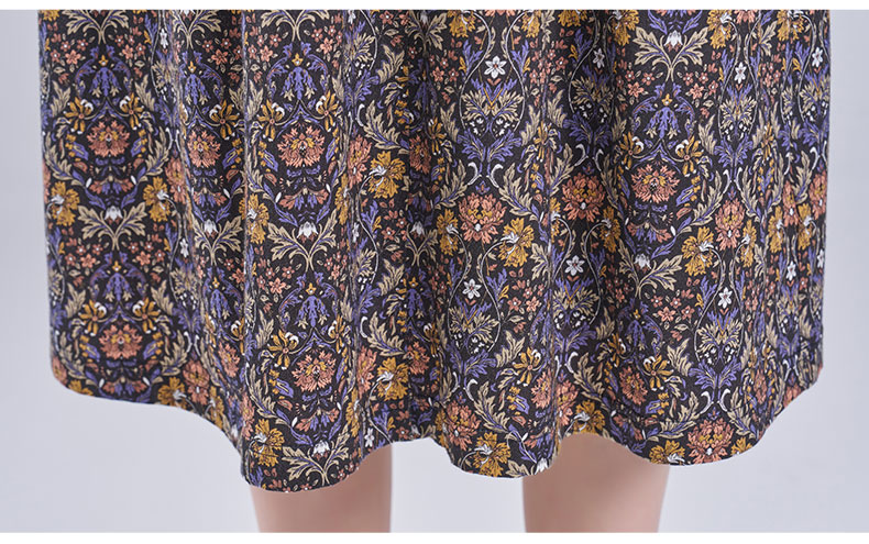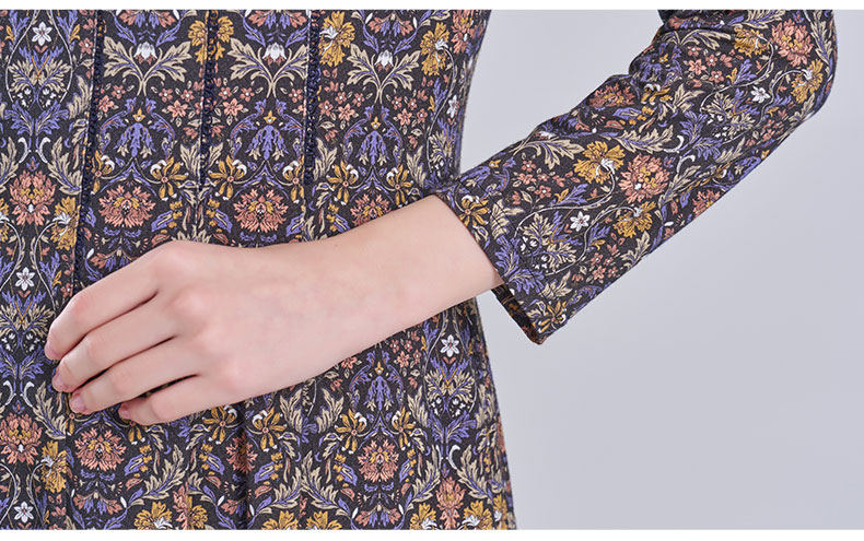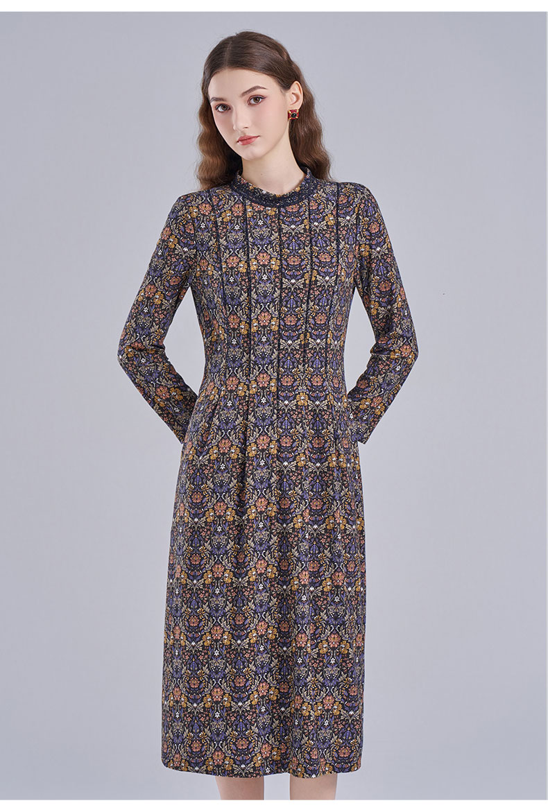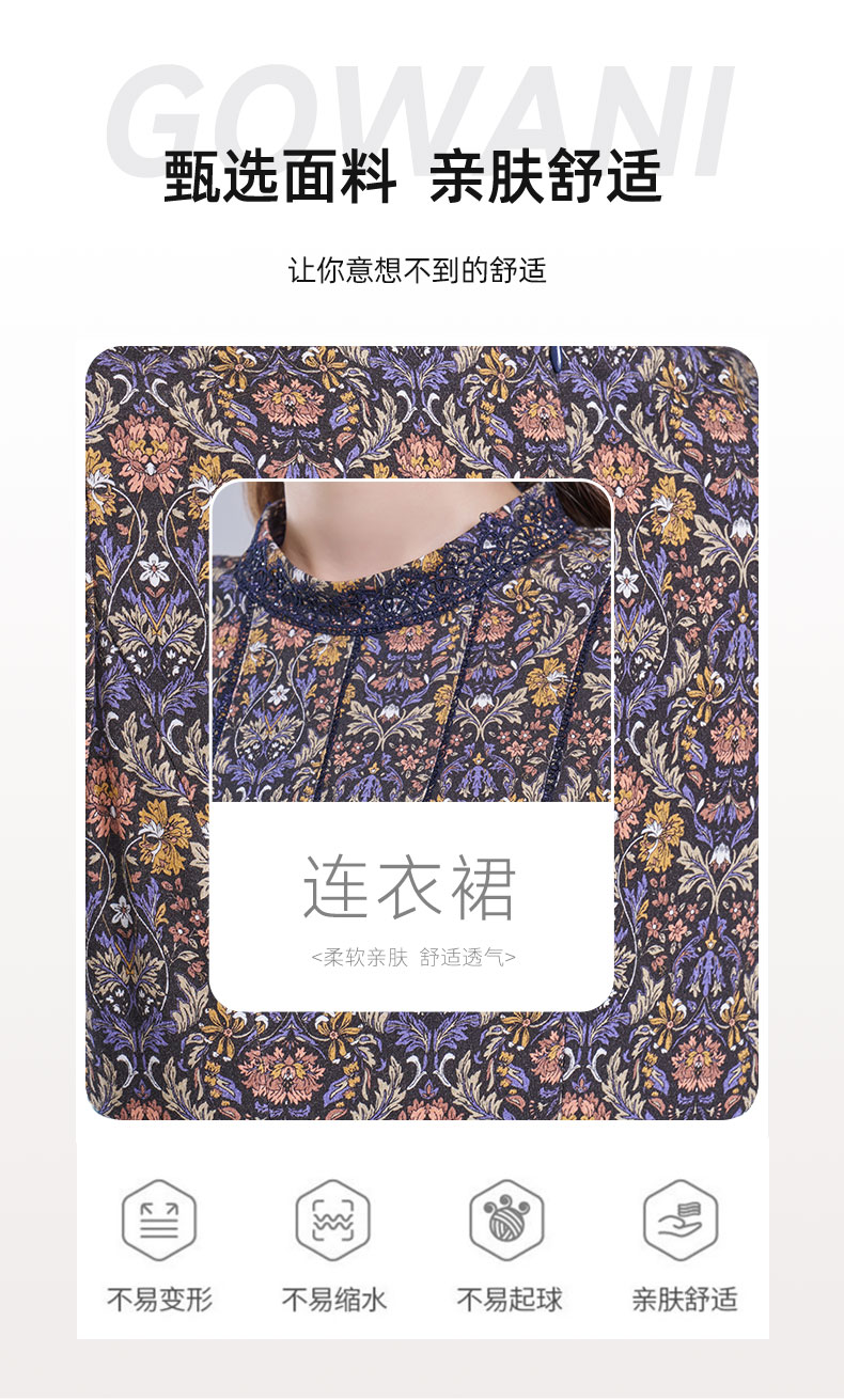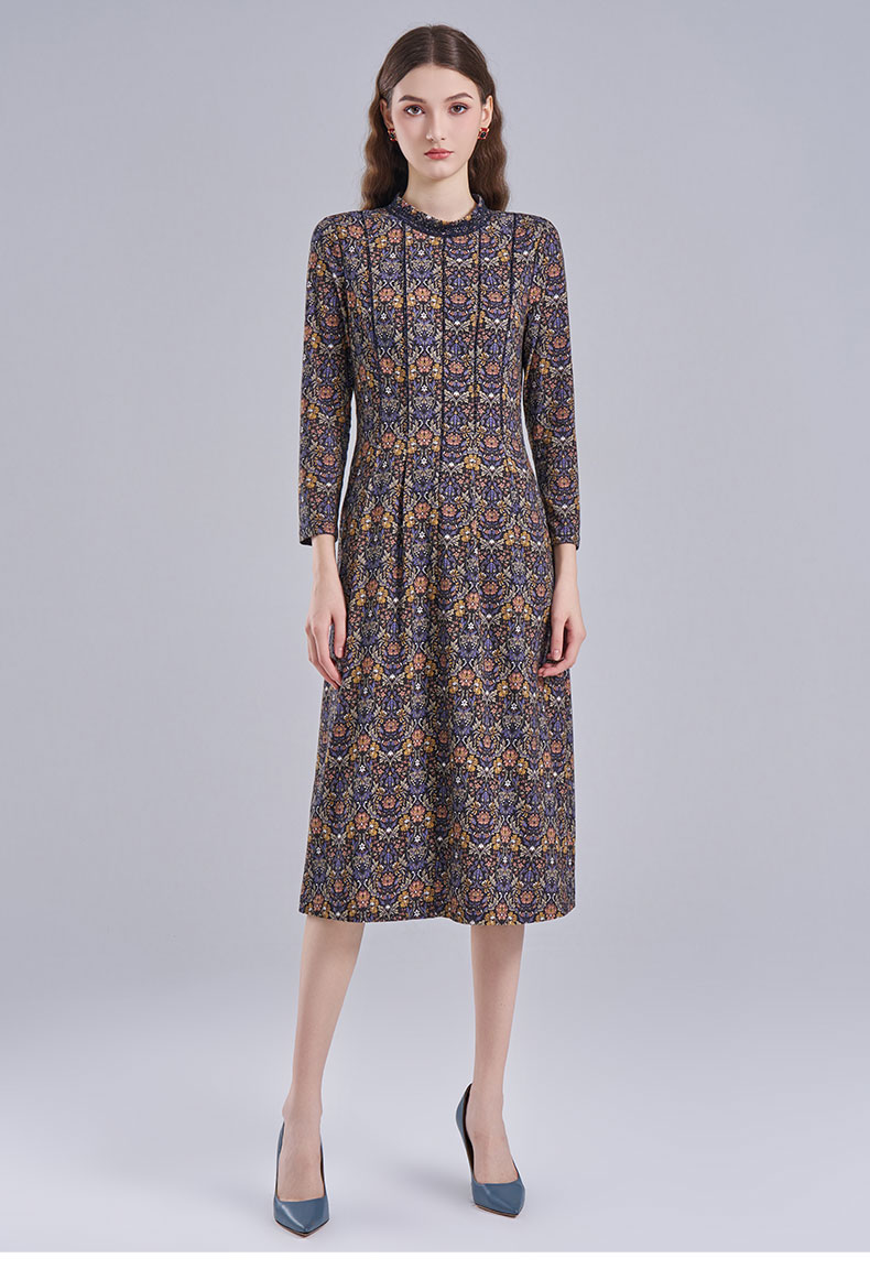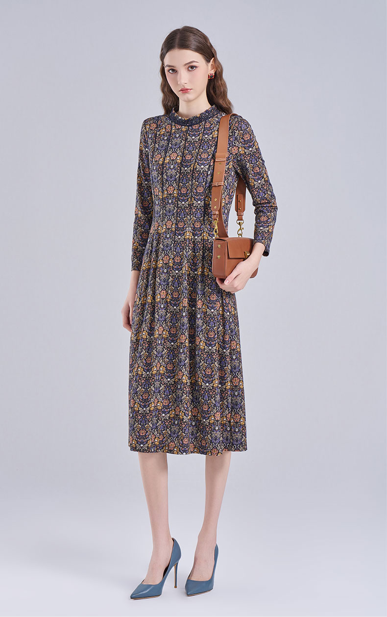 乔万尼2025秋新品高雅深蓝调印花拼接V领连衣裙ED3E320