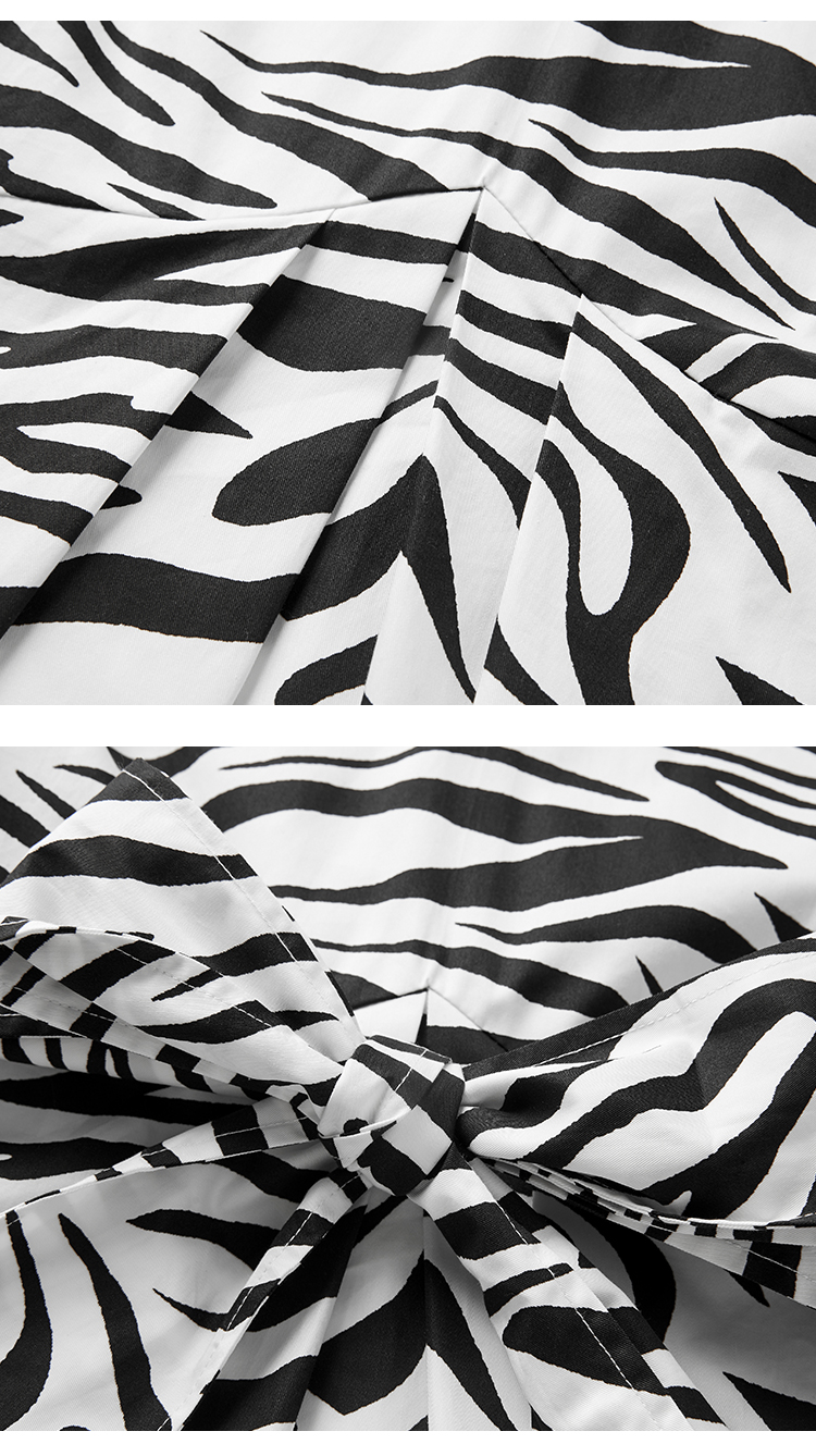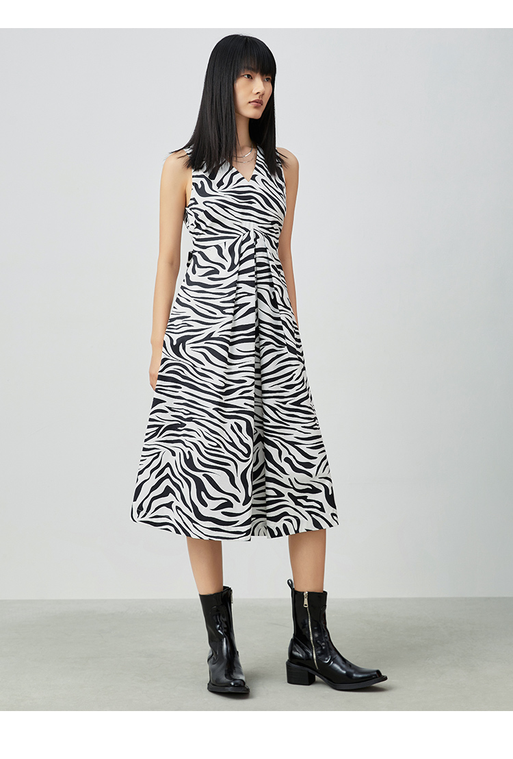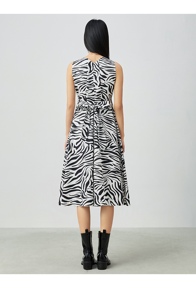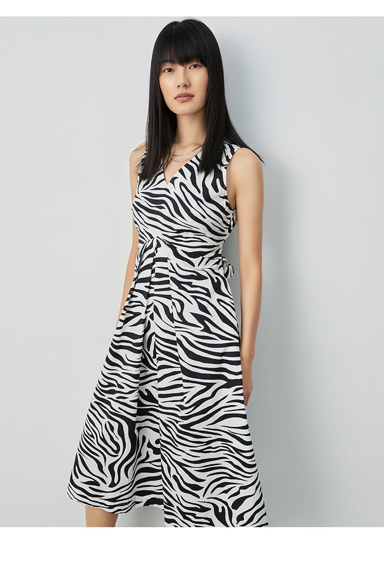 VIMAGE纬漫纪夏季新款V领收腰显瘦A摆复古斑马印花无袖连衣裙V1307920