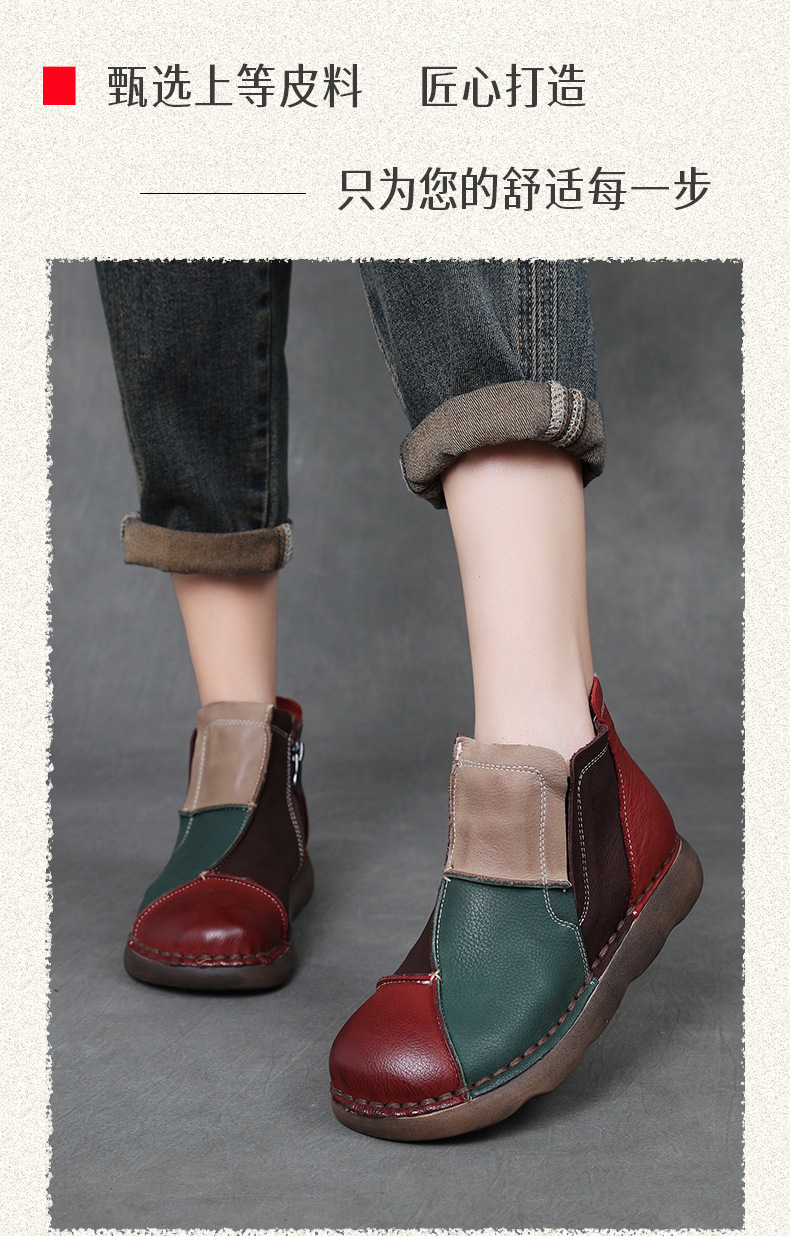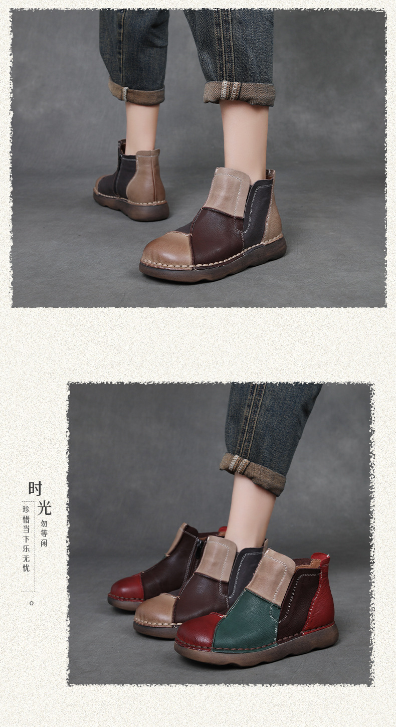 FR 85668短靴复古圆头平底拼色休闲单鞋