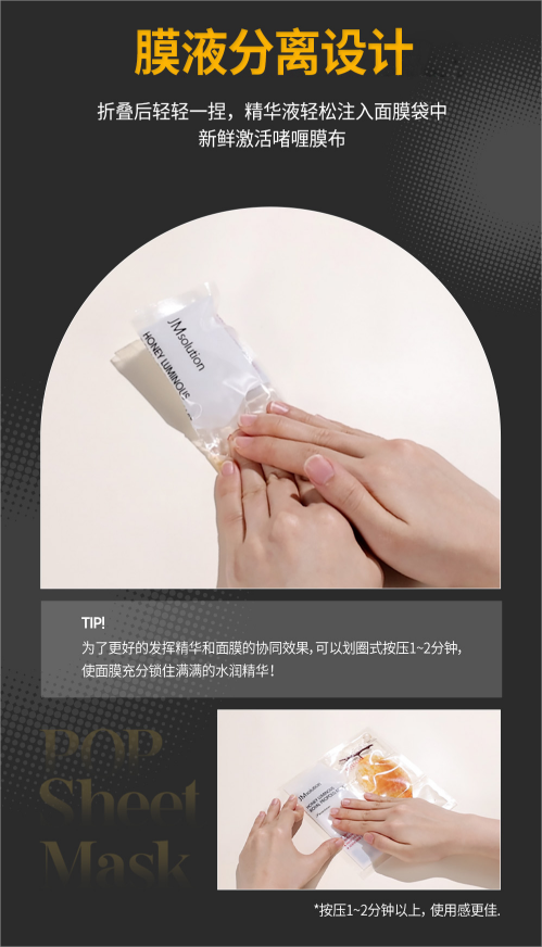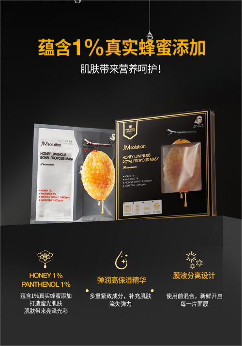 👑JM solution蜂蜜两步曲面膜-5片 💥蕴含天然真实蜂蜜,打造蜜光肌肤,为肌肤带来亮泽光彩 👍弹润高保湿精华,多重紧致成分,补充肌肤,减少流失弹力 💎膜液分离设计,更好发挥精华和面膜的协同效果 ✅有效:保湿弹润,淡纹充盈,滋养嫩肤 🙋♀️适合粗糙,干燥肌肤