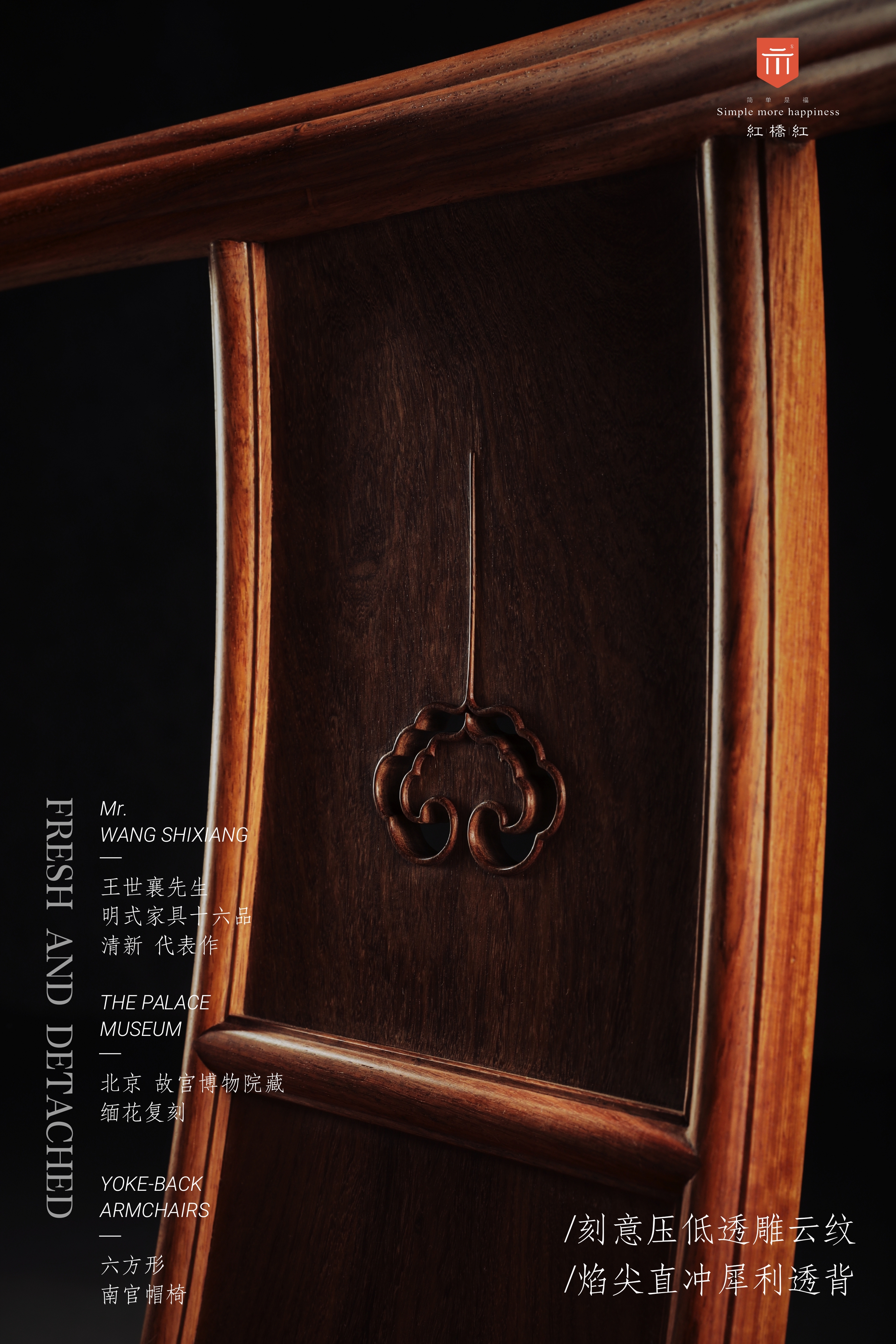 靠背板三段攒框打槽装板,边框也做出双混面,下段为云纹亮脚,中段装板,上段透雕云纹,故意将花纹压低,而使火焰似的长尖锋芒上贯伸展,精神、犀利,是一种别出心裁的装饰手法。