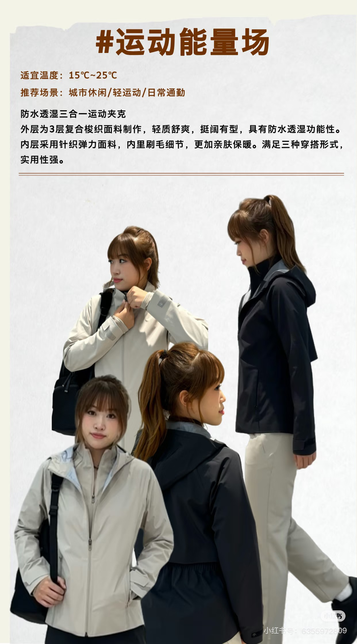 双重防护提升穿着安心感~针对不同场景设计多种灵活穿搭方式,轻松适应多变天气温度,于功能性面料与实用穿搭间平衡,适配日常通勤与户外场景,舒适又便利。