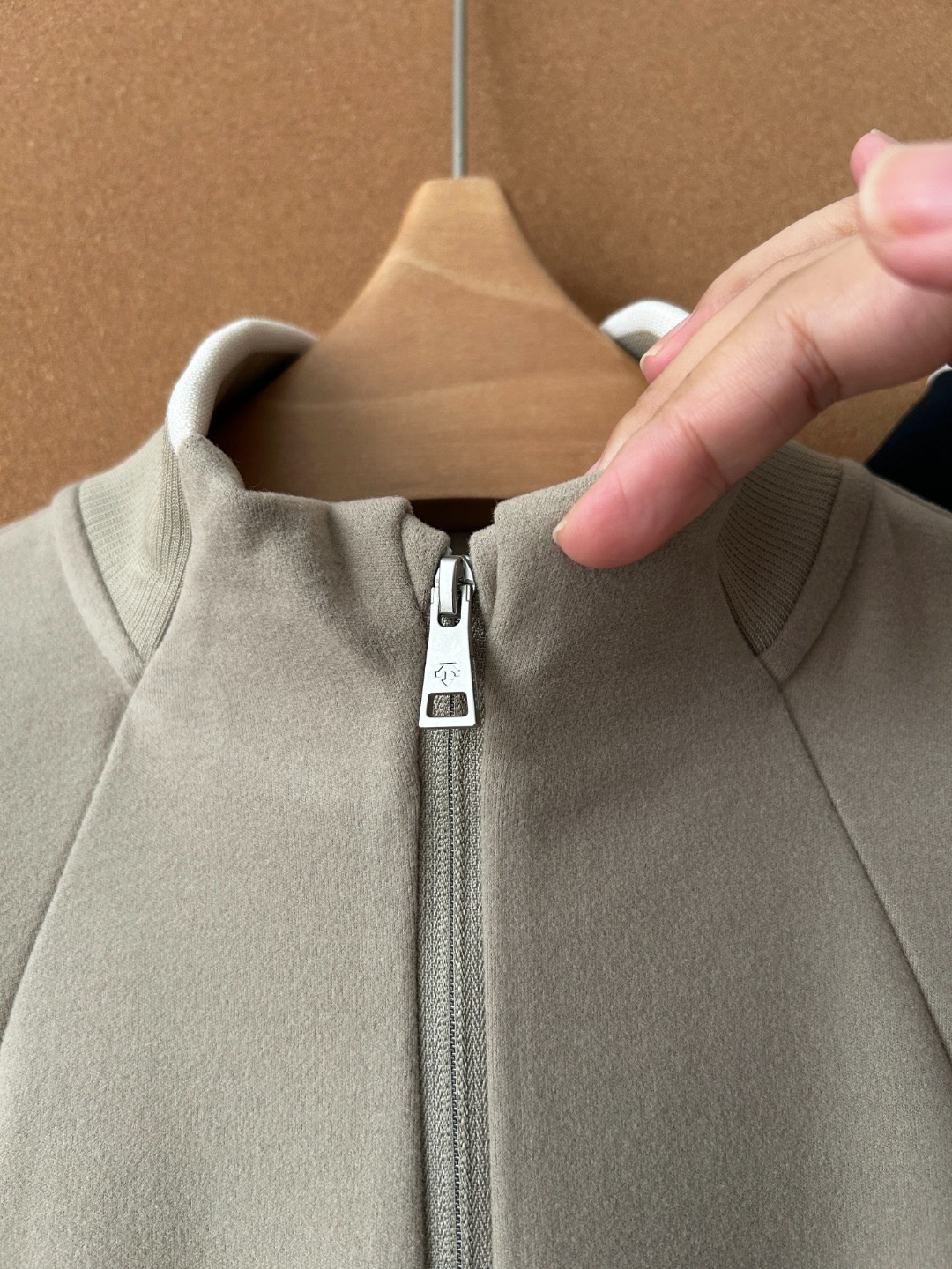 内里德绒外套来看细节,领口是2*2弹力螺纹料,松紧度适中