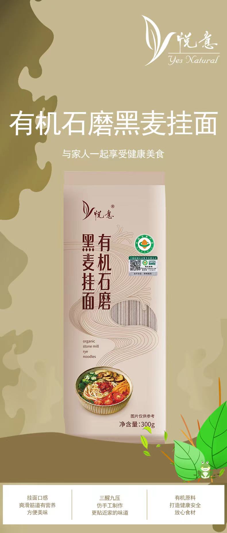 悦意有机石磨黑麦挂面 300g 麦香浓郁 筋道爽口