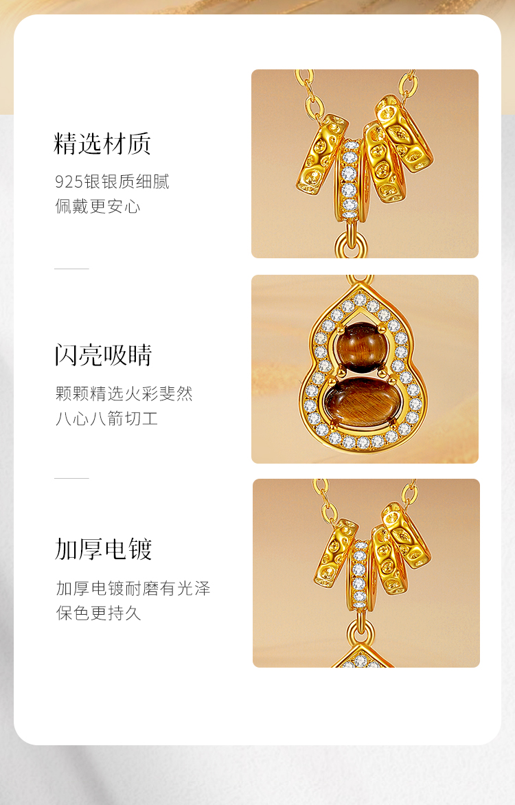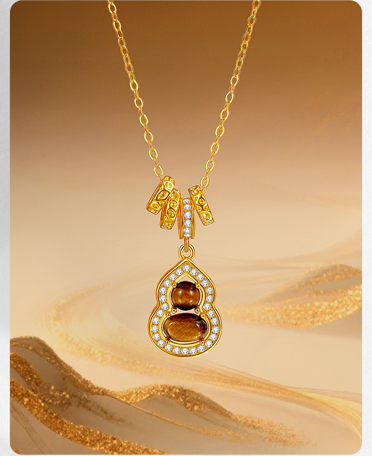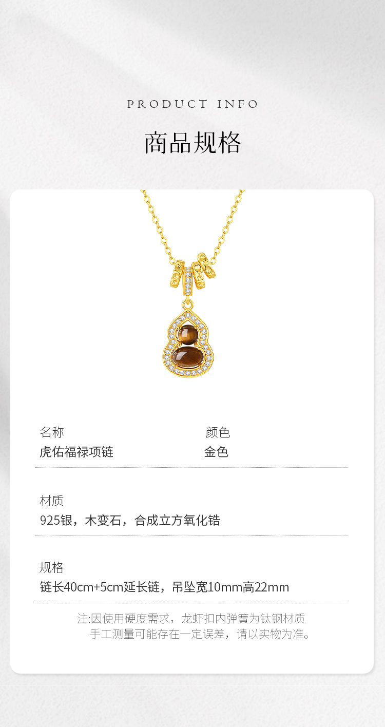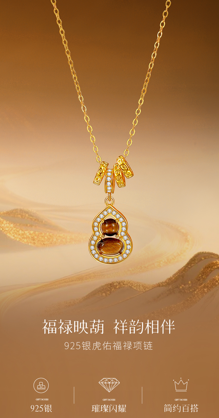Winy S925 银镀金虎佑福禄项链 木变石虎眼石 + 合成立方氧化锆 带证书国风吉祥锁骨链