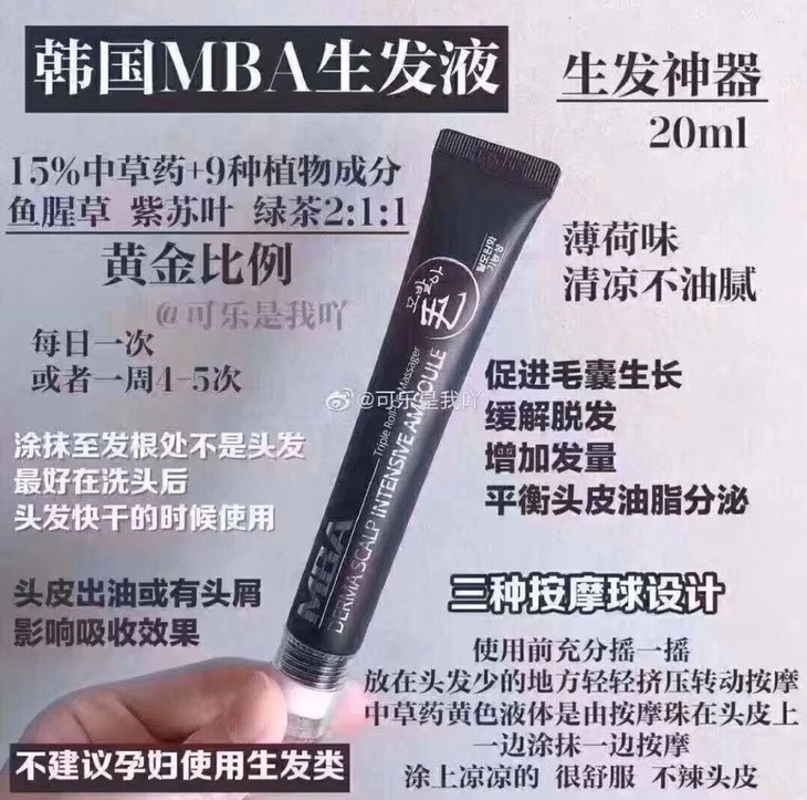MBA 鱼腥草生发浓缩精华滚珠生发液👍宋祖儿乔欣李佳琪推荐的MBA生发液,脱发星人了解一下🙋!现在很多人掉发脱发比奶奶辈的人都厉害👵!!这款头皮护理精华,在韩国红了20多年🔥。以鱼腥草等多种植物提取精华2:1:1黄金比例,最主要的它有3个滚珠按摩头可以刺激我们的头皮😬,打开头皮毛囊从而起到生发效果,神奇!!用了不用再画发际线啦,秃头女孩的福音🌟~