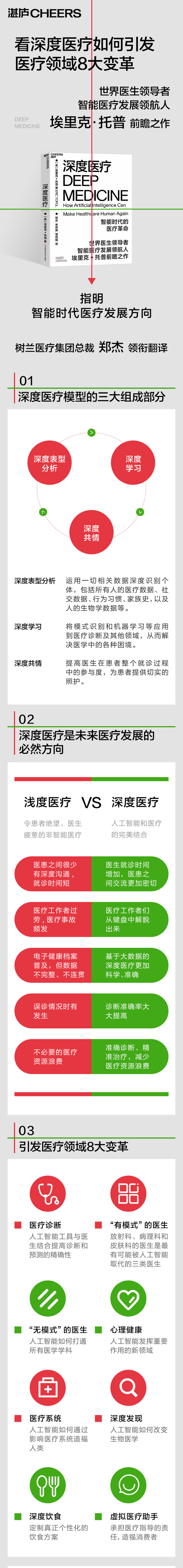 以往对医疗人工智能的描述中,强调更多的是技术,是数据与人工智能,是人工智能取代医生。在《深度医疗》中,我们欣喜地看到了人的回归、人性的回归,未来的“深度医疗”不仅仅是深度数字化、深度学习,更是深度共情。这是一本值得“深度学习”的好书。