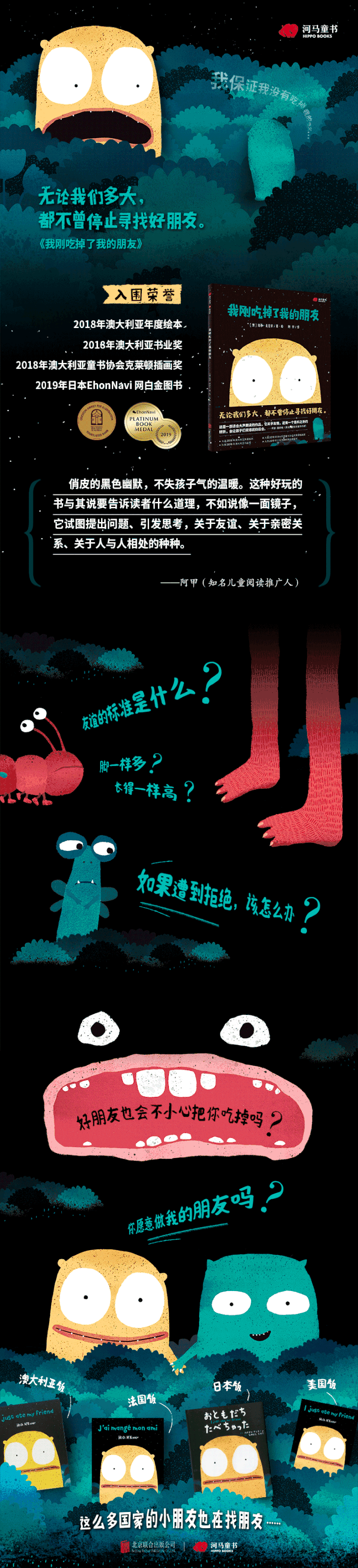 无论我们多大,都不曾停止寻找好朋友。“这种好玩的书与其说要告诉读者什么道理,不如说像一面镜子,它试图提出问题、引发思考,关于友谊、关于亲密关系……”(阿甲)入选澳大利亚童书协会克莱顿插画奖。(河马童书)