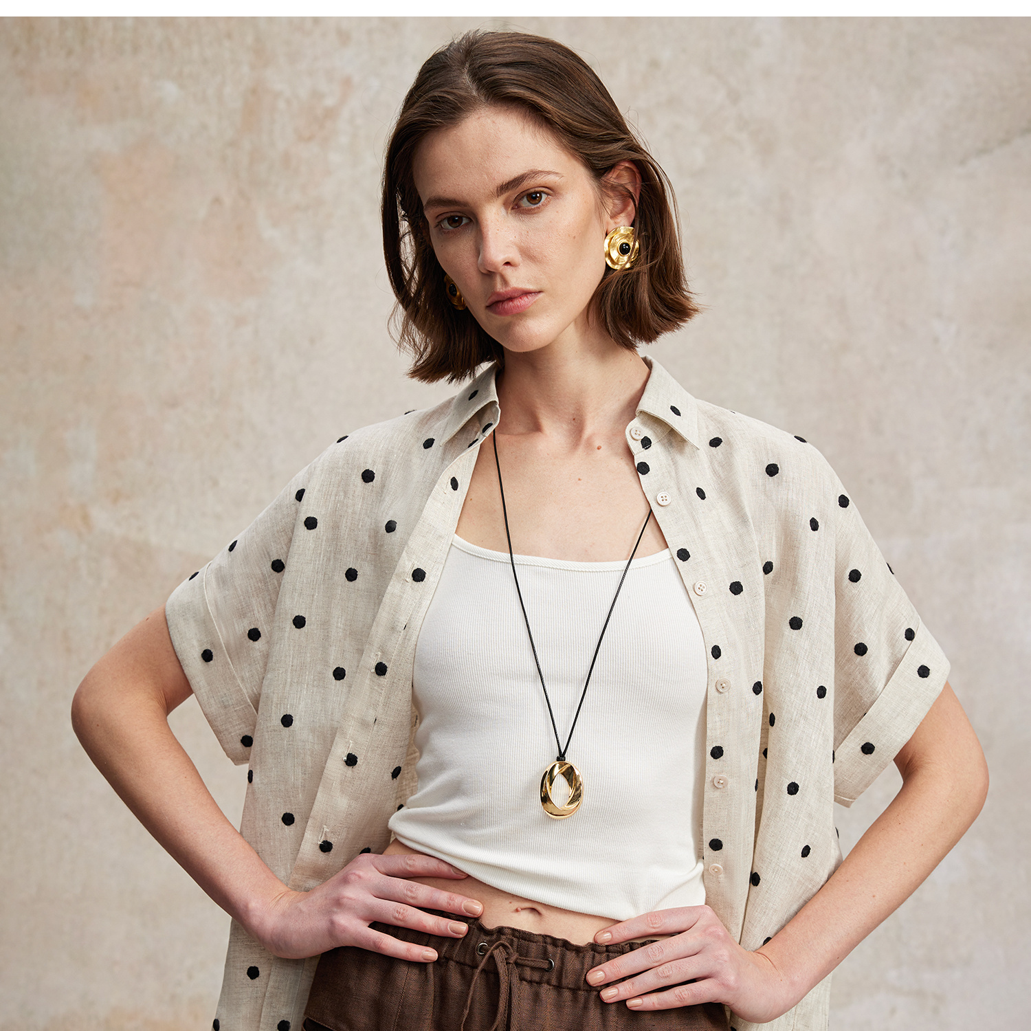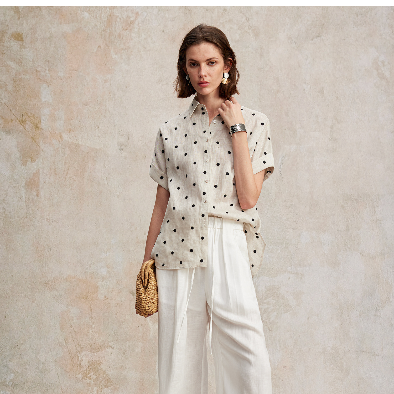 C+IMPRESS/西嘉南法假日博主风全亚麻衬衫女夏季波点短袖宽松衬衣CS2502072