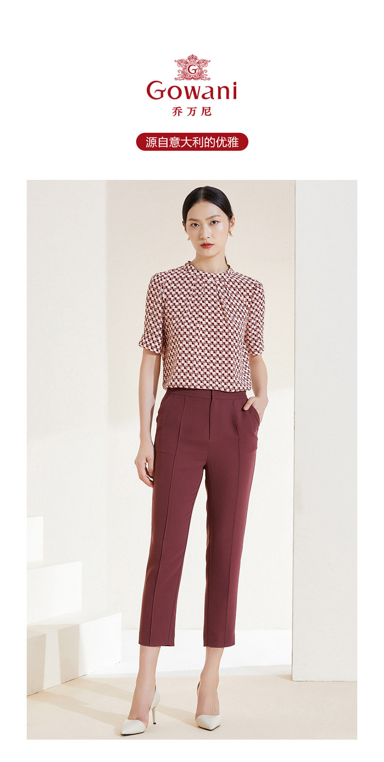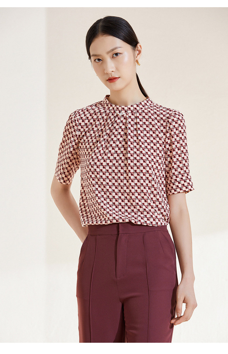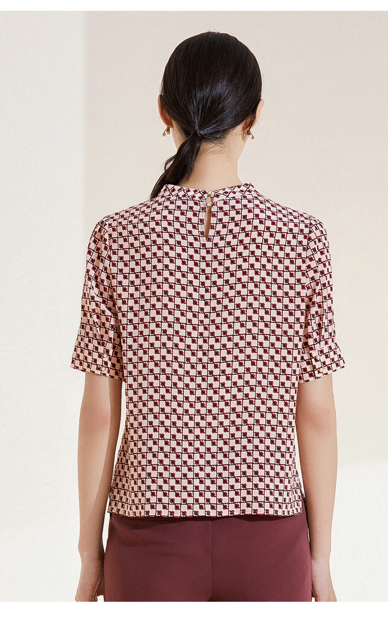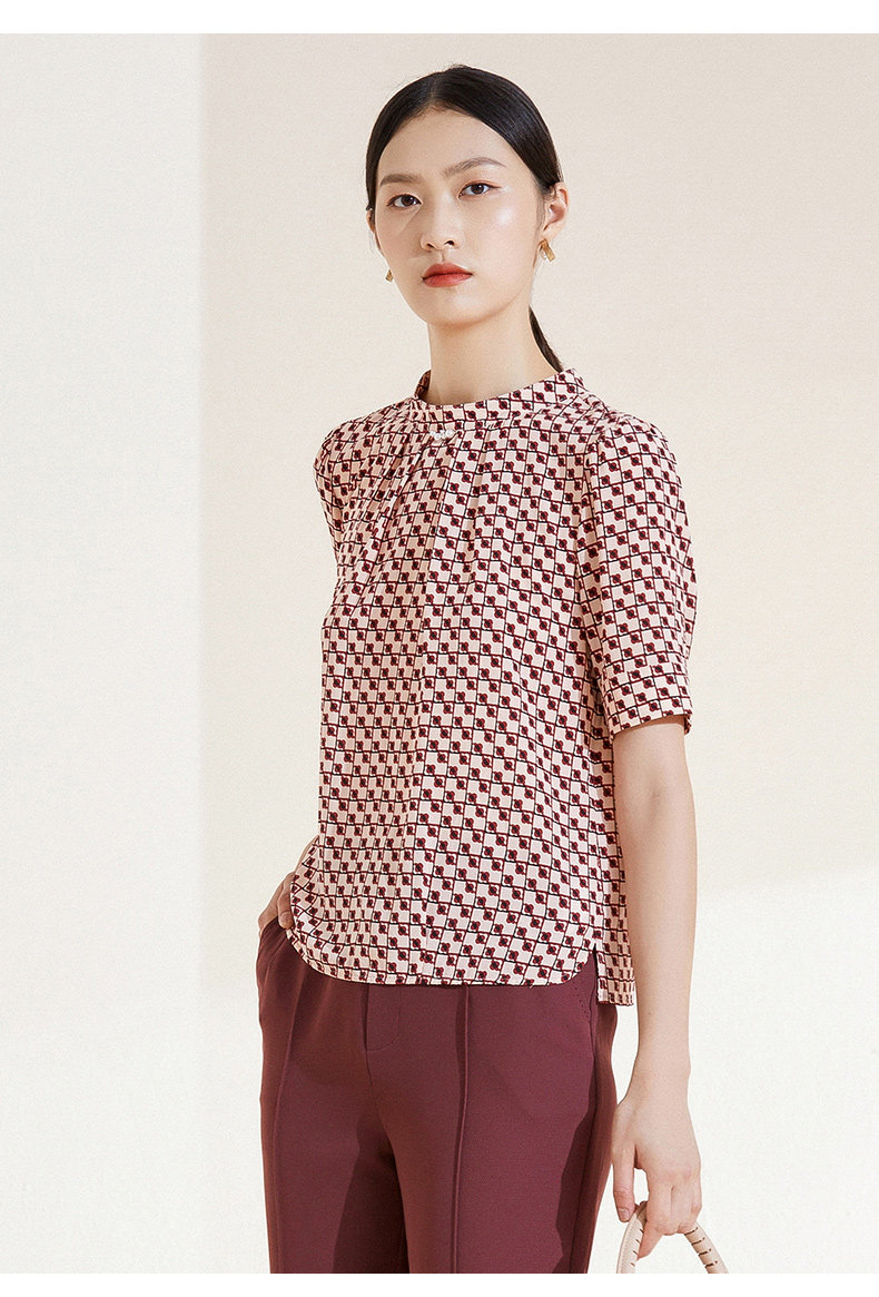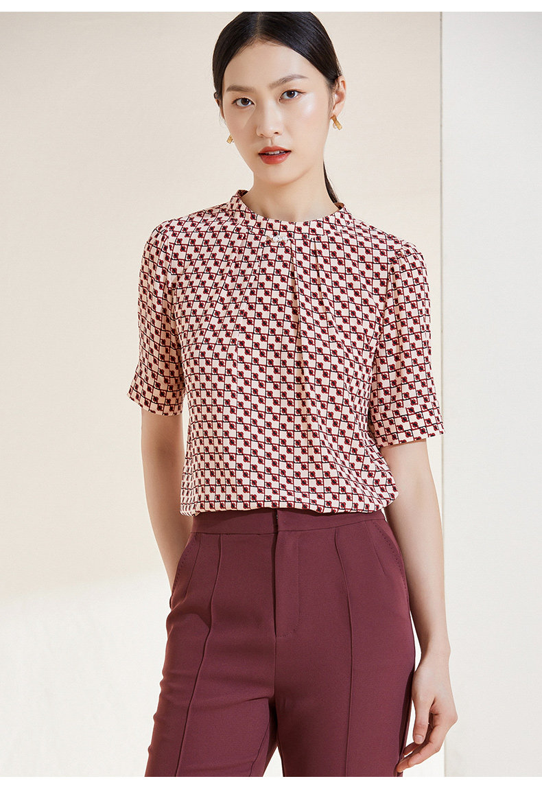 乔万尼真丝衬衫小立领珍珠格纹设计感短袖衬衣EI2C749