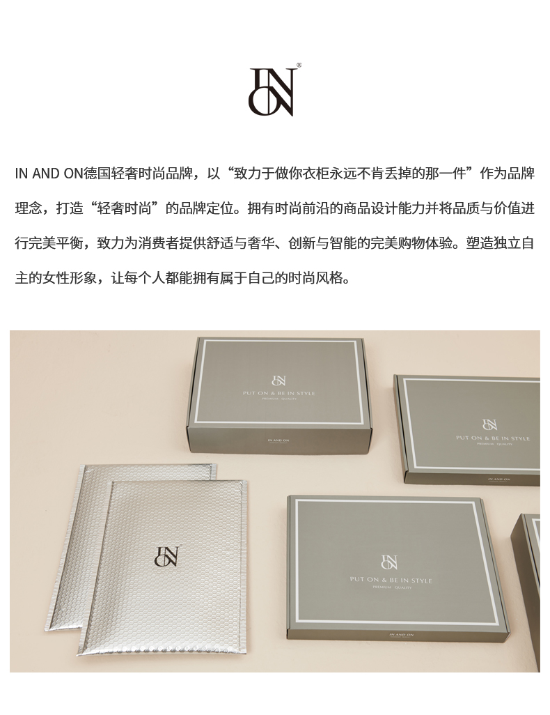 - IN AND ON—轻奢时尚品牌,以“致力于做你衣柜永远不肯丢掉的那一件”作为品牌理念,打造“轻奢时尚”的品牌定位。拥有时尚前沿的商品设计能力并将品质与价值进行完美平衡,致力为消费者提供舒适与奢华、创新与智能的完美购物体验。塑造独立自主的女性形象,让每个人都能拥有属于自己的时尚风格。