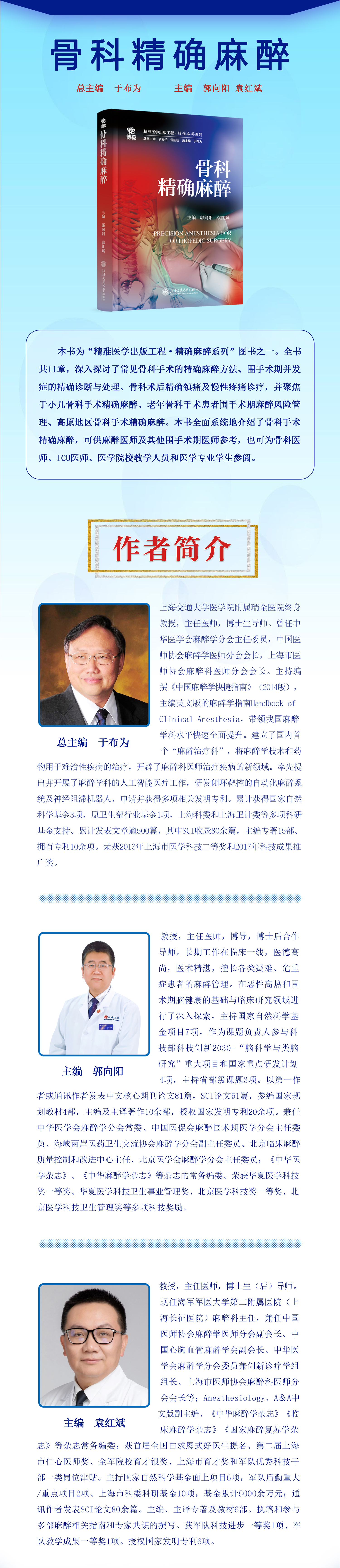 本书为“精准医学出版工程·精确麻醉系列”图书之一。全书共11章,深入探讨了常见骨科手术的精确麻醉方法、围手术期并发症的精确诊断与处理、骨科术后精确镇痛及慢性疼痛诊疗,并聚焦于小儿骨科手术精确麻醉、老年骨科手术患者围手术期麻醉风险管理、高原地区骨科手术精确麻醉。本书全面系统地介绍了骨科手术精确麻醉,可供麻醉医师及其他围手术期医师参考,也可为骨科医师、ICU医师、医学院校教学人员和医学专业学生参阅。