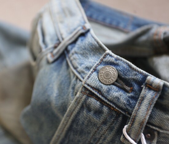 五袋式结构 裤襟是全纽扣的 只有第一个扣上有刻字 小铆钉上也都有刻字