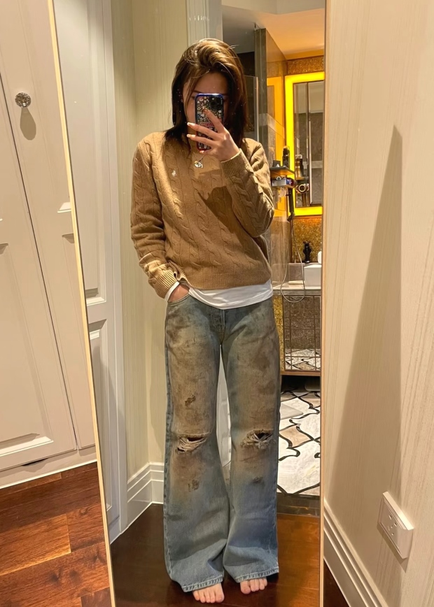 两处破洞 左/膝盖上 右/刚好膝盖 良心话 还是挺拉腿长的
