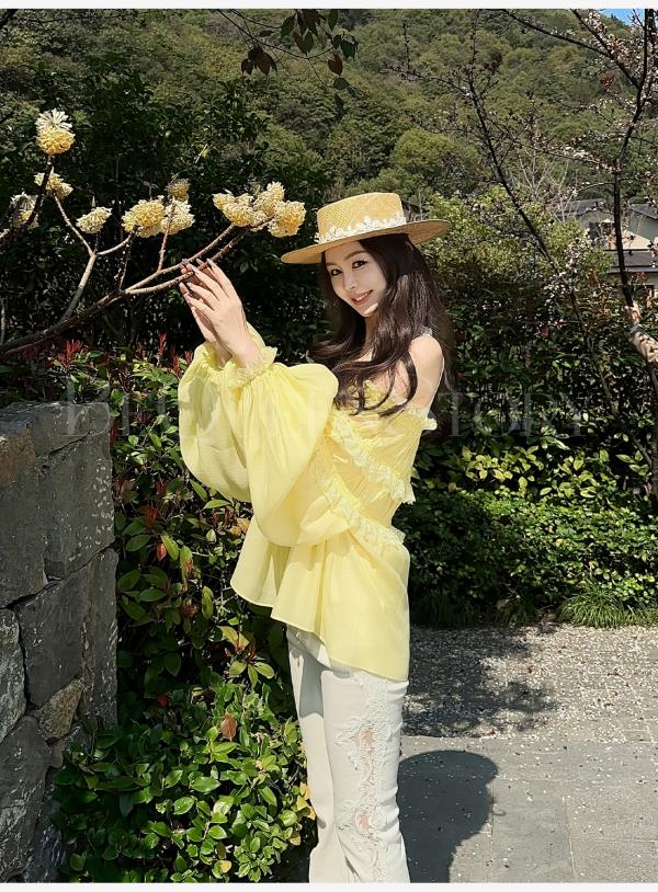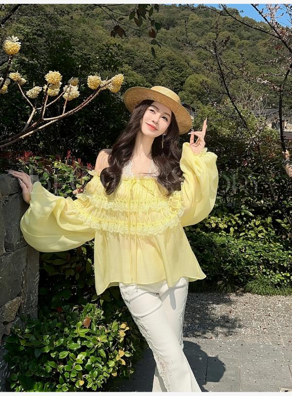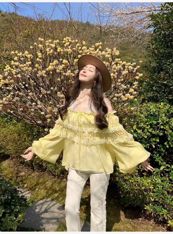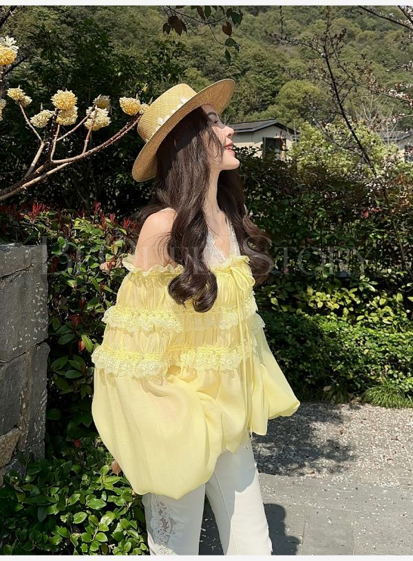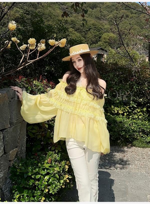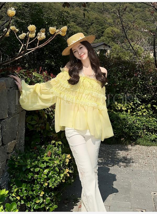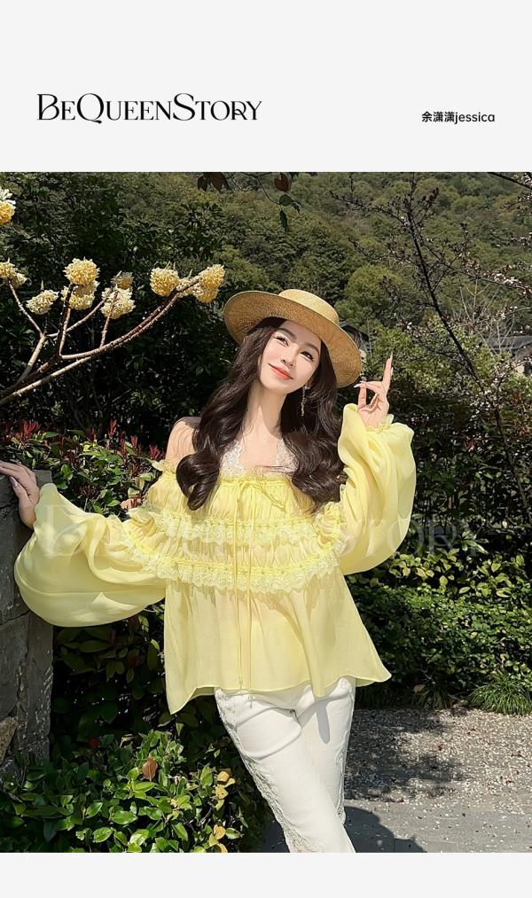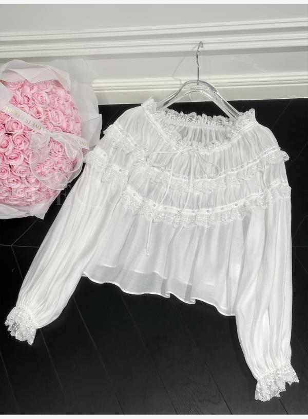 BeQueenStory【温柔水仙】层次感花边手工钉珠一字肩长袖衬衣