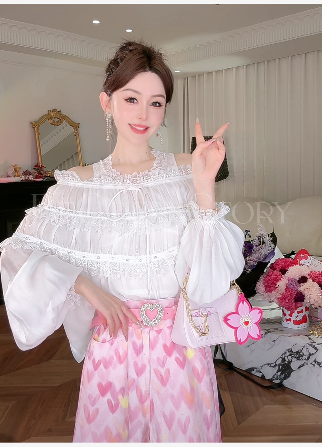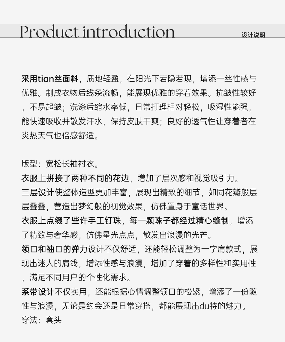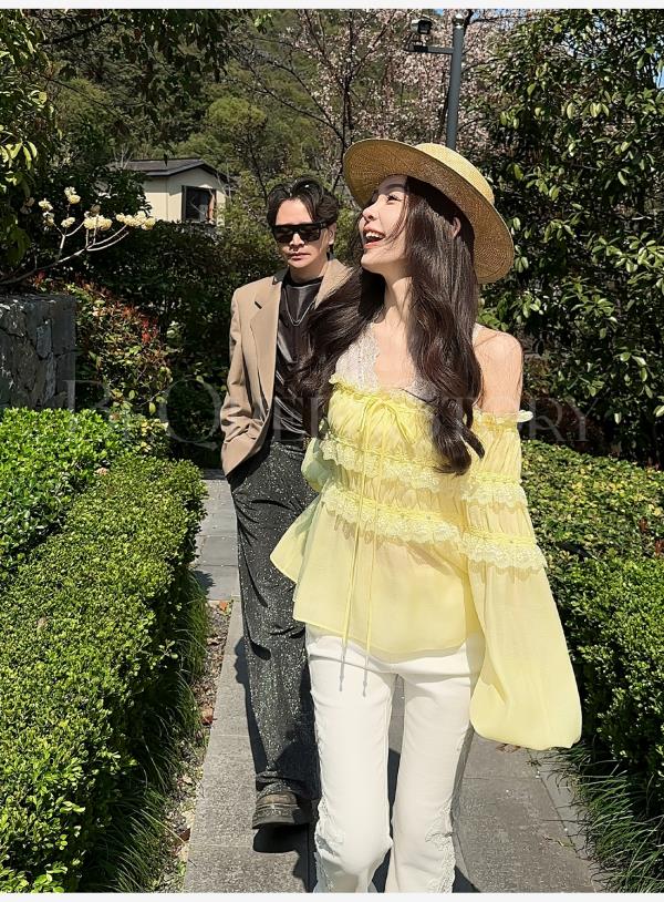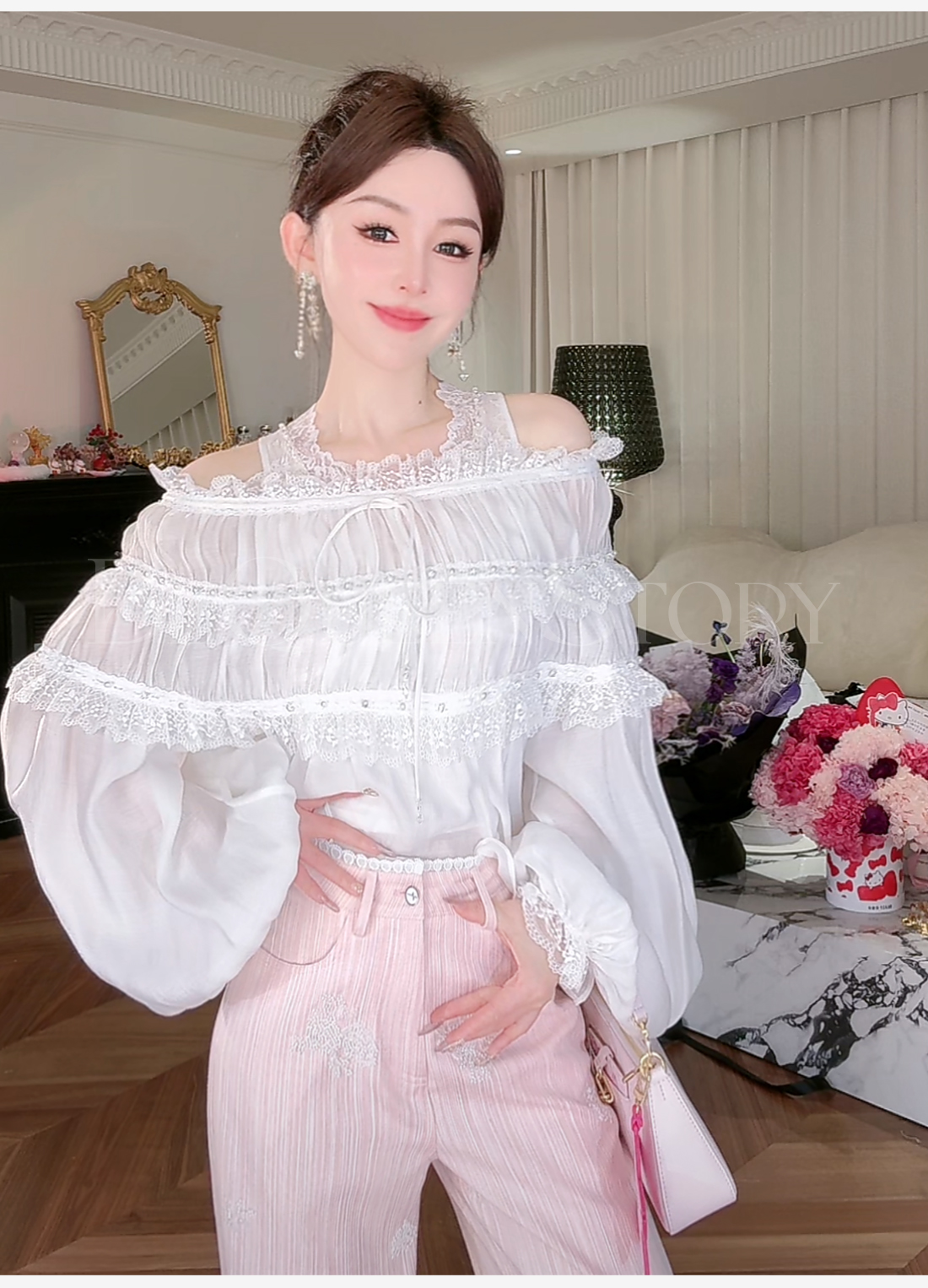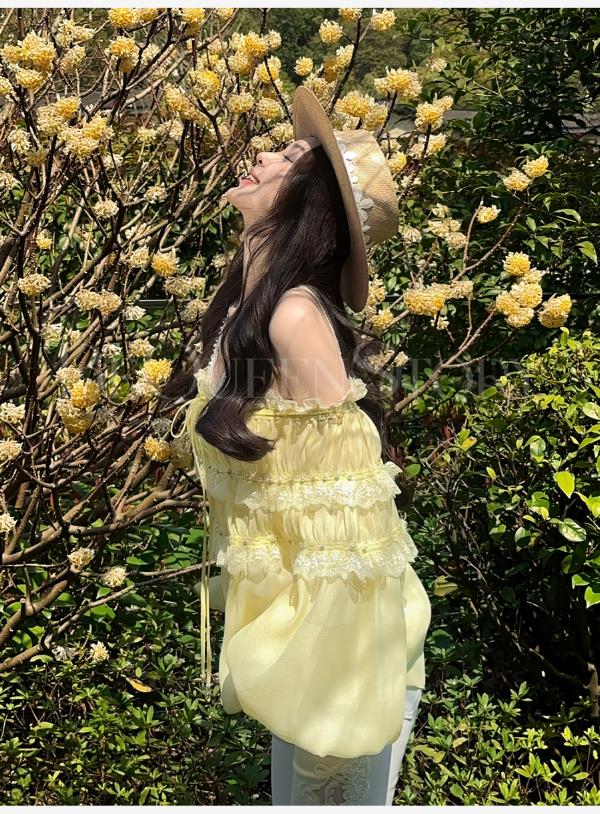 BeQueenStory【温柔水仙】层次感花边手工钉珠一字肩长袖衬衣