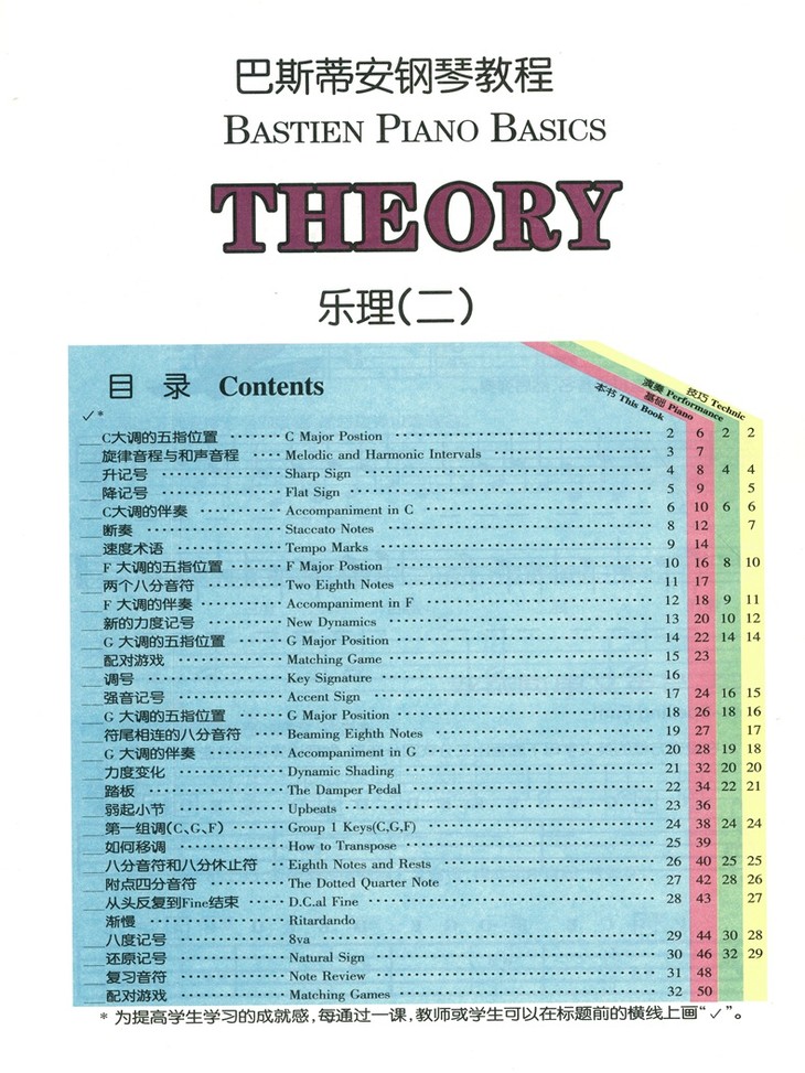 《乐理》是与《基础》相辅相成的配套教程,将浅显易懂的乐理知识融入简短的小乐曲中,寓教于乐,便于学生更加深入地理解和表现音乐。