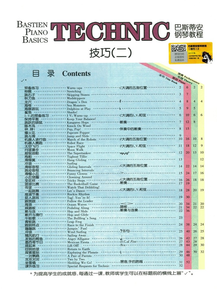 《技巧》包括许多有趣而又具有效果的练习,帮助提高手指弹奏的协调能力与灵活性,可作为弹奏乐曲之前的预备练习。