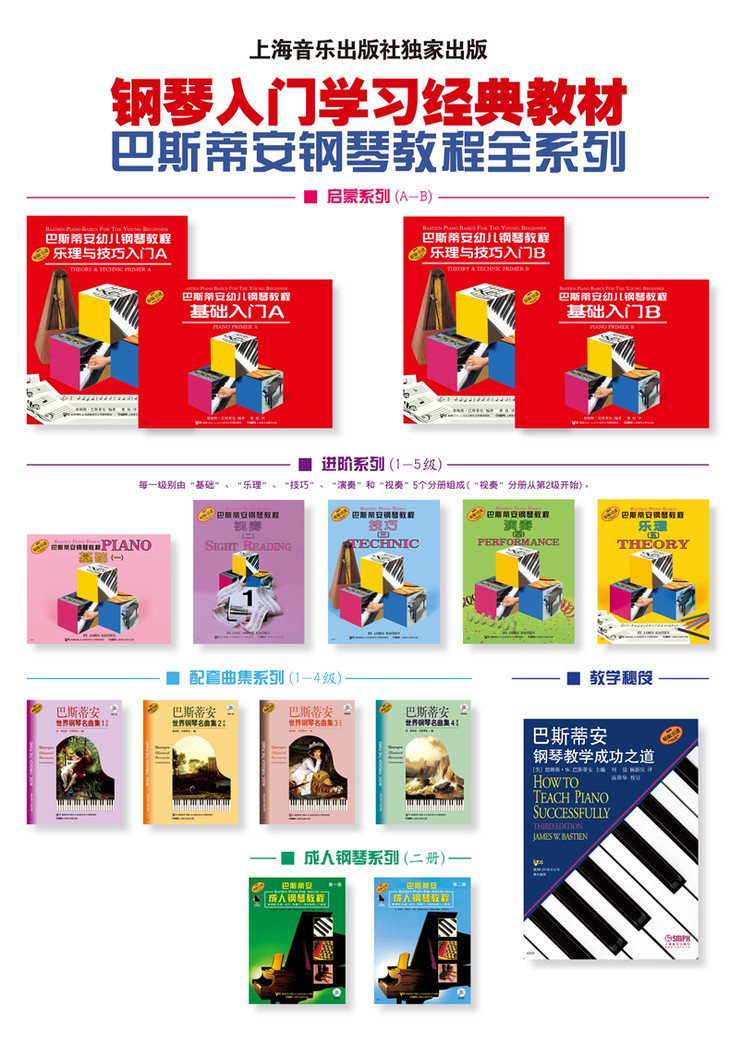 《巴斯蒂安钢琴教程》是根据儿童生理、心理特征编写的一套最易学习、最具趣味性,并附有引导性详解的钢琴基础教程。它倡导快乐学习的理念,能够让学生快速、轻松地掌握弹奏、伴奏、轻松地掌握弹奏、伴奏、弹唱的技巧,增加学习自信心,引发学习动机,满足成就感。因此,已被译成多国文字版本,成为世界各国儿童普遍欢迎的钢琴教材。