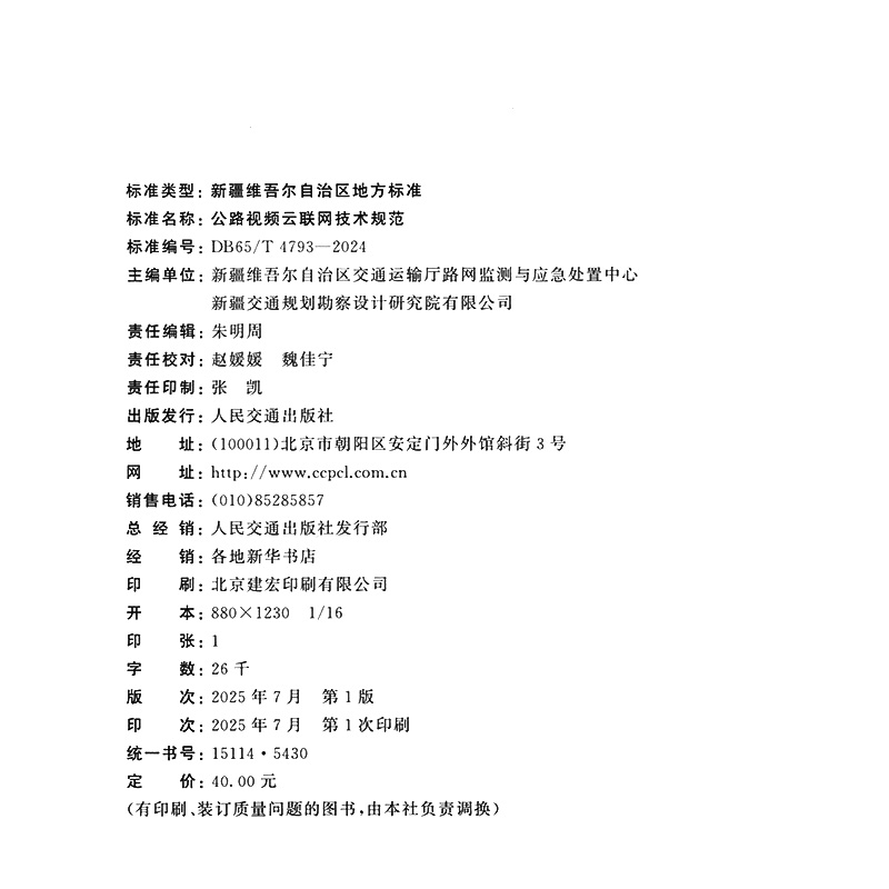 书名:公路视频云联网技术规范(DB65/T 4793—2024)