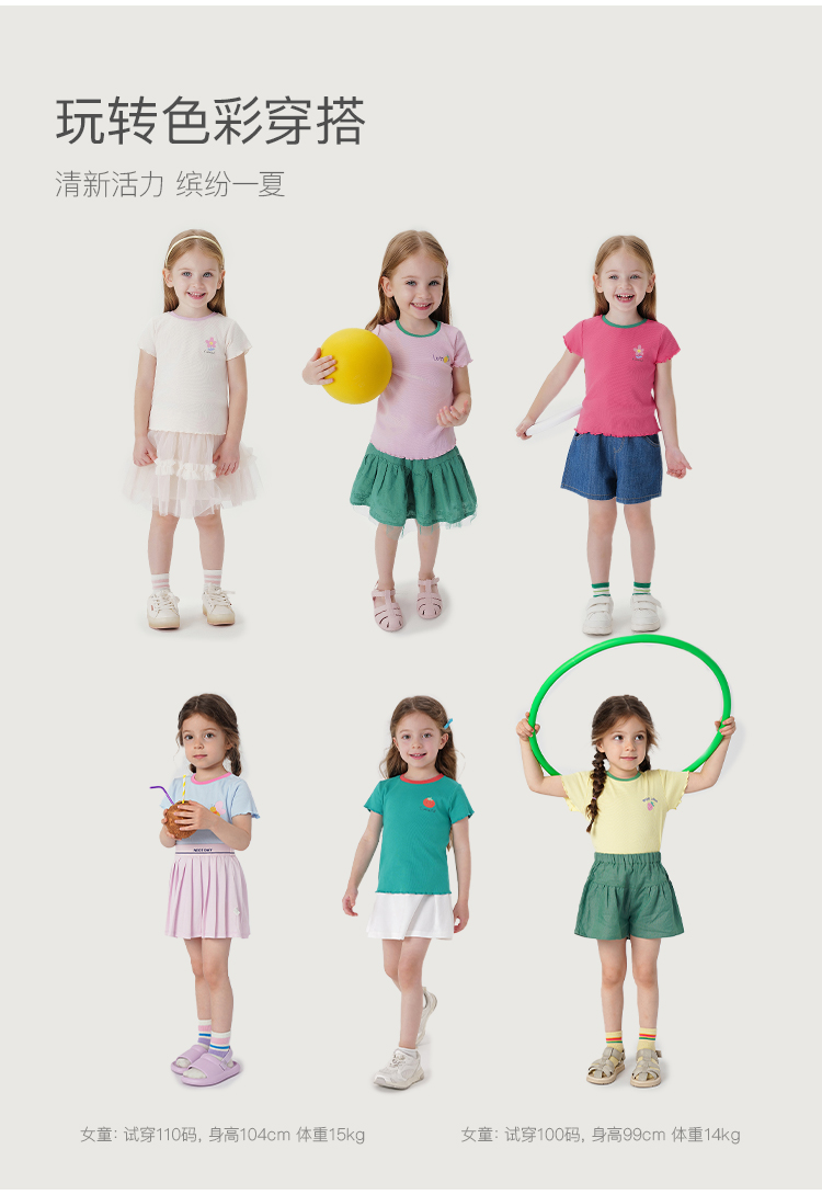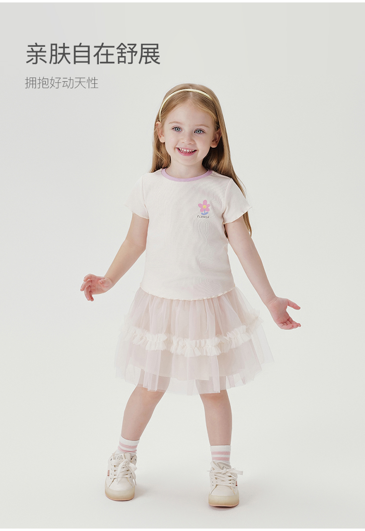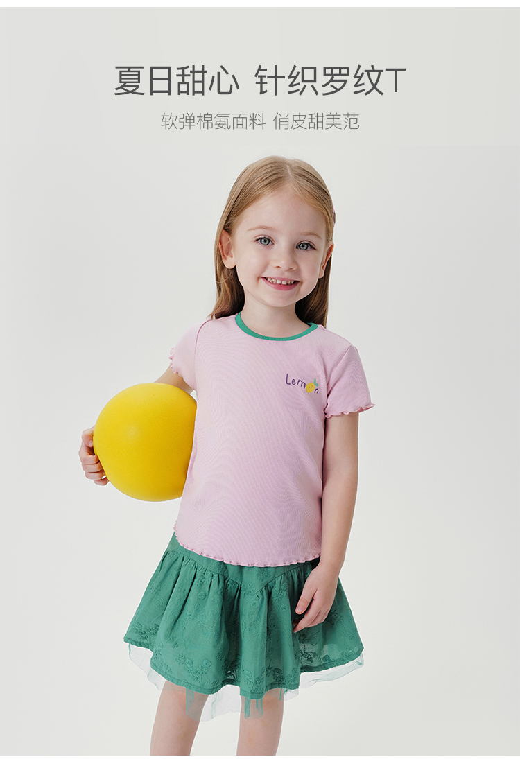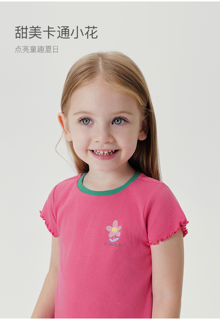 马克珍妮新款夏装 女童弹力针织撞色花边短袖T恤230876