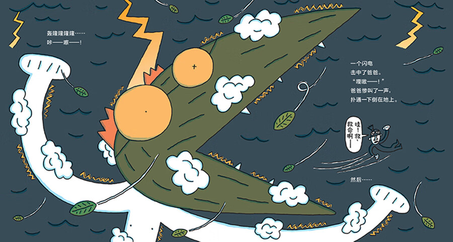 为了配合翻页设计,宫西达也还在很多地方使用了接续词,“正在这时……”“就在那时……”“仔细一看——”“正说着……”“但是——”等等,他用省略号或者破折号把后半句话留在下一页,这有点儿像中国评书艺人的“请听下回分解”,吊起儿童的胃口,激励儿童去翻页。