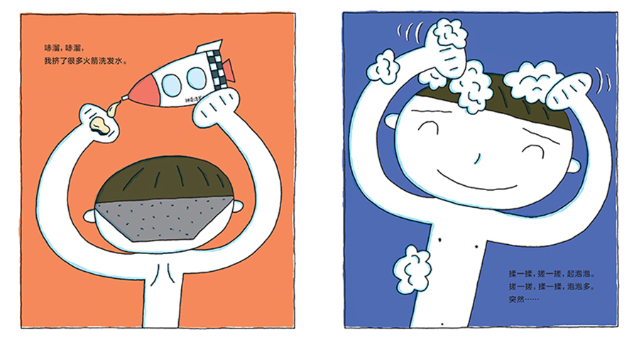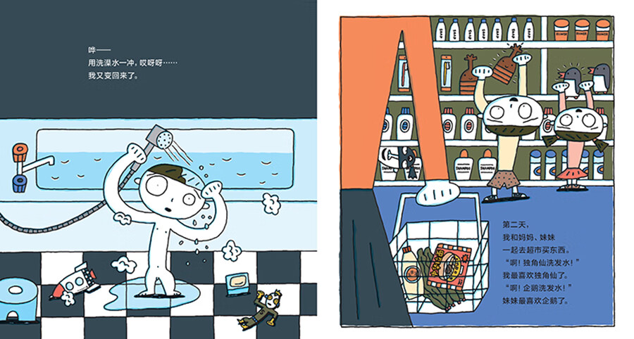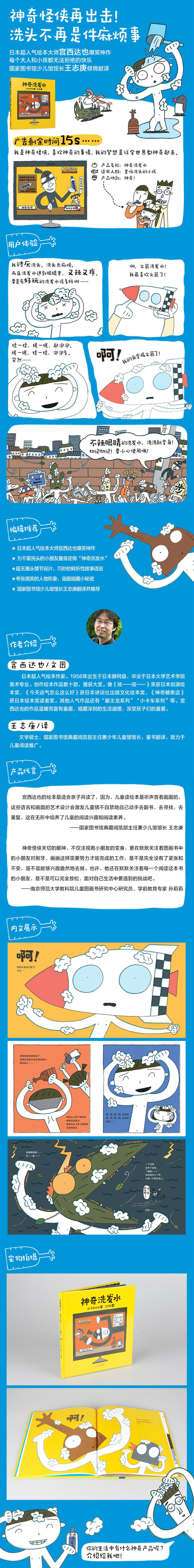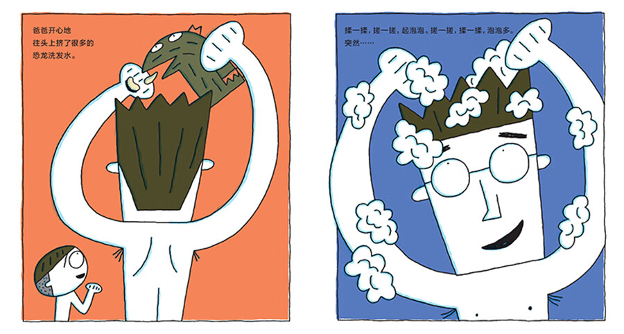 我最讨厌洗头了。洗起头来太麻烦,而且进到眼睛里,又辣又疼。“要是有好玩的洗发水该多好啊……”于是,神奇洗发水出现啦!火箭款、独角仙款、企鹅款……而且,每次用神奇洗发水洗完头,我们的脑袋都会变成火箭、独角仙、企鹅,第二天又能变回来,太好玩啦!就这样,神奇洗发水在全世界流行起来。可是有一天,爸爸洗完头后变成了巨大的恐龙……这下可麻烦了。看来,还是用普通洗发水洗头比较令人放心呀!