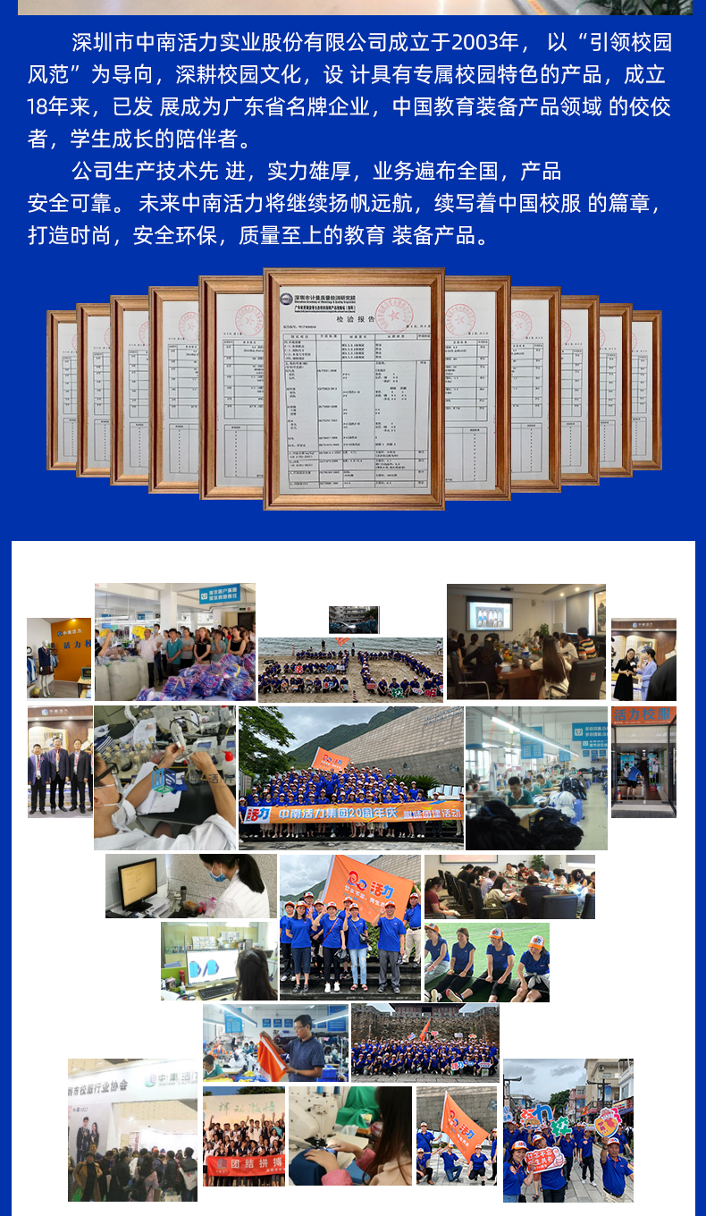 - 活力校服由深圳市中南活力实业股份有限公司创建的品牌,深圳二十一年老品牌,教育局中标企业;主营深圳校服、广州校服、东莞校服、佛山校服、肇庆校服、江苏校服、鞋袜、学生床上用品等学生课桌椅一站式教育领域产品