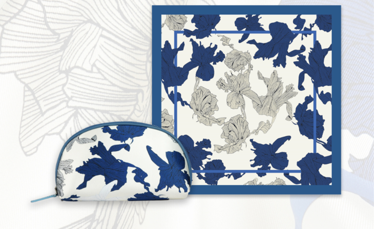 凯喜雅推出的“胭脂染”丝巾,设计灵感便源自这位传奇画家的《花鸟画册》。设计师取材自画册中临崖绽放的鸢尾,将郎世宁笔下明艳的花栽植在丝绸缎面上。丝巾上的鸢尾整体构图轻盈,中间留白,摇曳的鸢尾围绕其间,迎风轻舞。图案以动景衬托意境,借西式绘画风格,将中式美学的委婉含蓄极致表达,留下无尽想象。