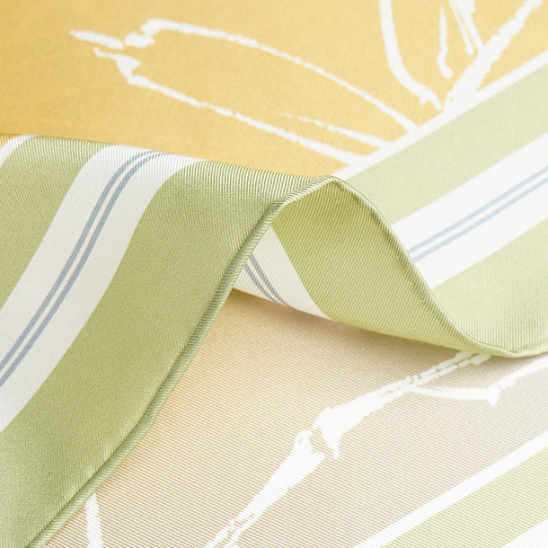 该款丝巾以林间修竹为设计灵感,阳光和煦,翠竹成荫,借斑驳的竹影映衬竹的挺拔身姿。清风拂来,竹叶簌簌作响,婆娑起舞,偶有俏皮活泼的蜻蜓落在竹叶尖作点缀,丝巾画面勾勒出一派轻松宁静的自然景象,表达对高洁品质的追求与赞美,渲染清新和煦、恬淡宁静的典雅意境。